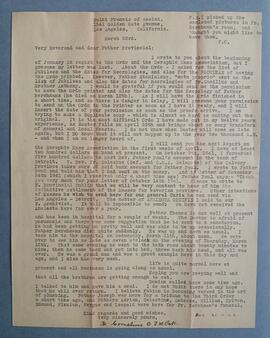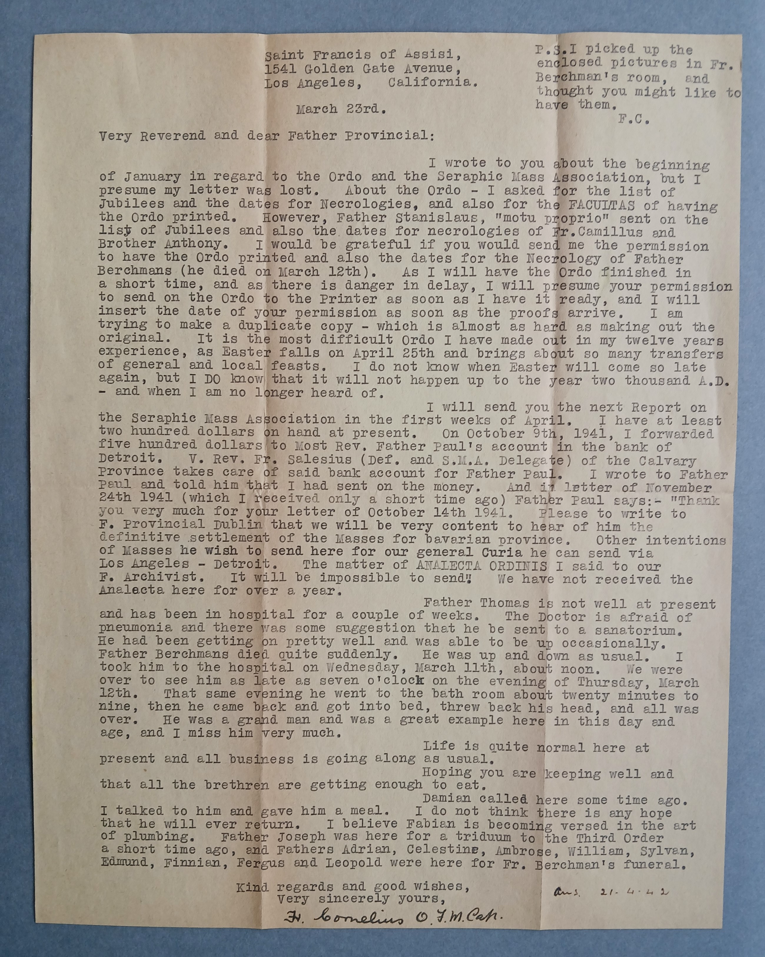 Letter from Fr. Cornelius Hyland OFM Cap., St. Francis of Assisi Church, Los Angeles, to Fr. Colman Griffin OFM Cap., Provincial Minister, referring to the preparation of the ‘Ordo’ and matters pertaining to the Seraphic Mass Association. He also provides an account of the death of Fr. Berchmans Cantillon OFM Cap. He writes ‘Father Berchmans died quite suddenly. He was up and down as usual. I took him to the hospital on Wednesday, March 11th, about noon. We were over to see him as late as seven o'clock on the evening of Thursday, March 12th. That same evening he went to the bath room about twenty minutes to nine, then he came back and got into bed, threw back his head, and all was over. He was a grand man and was a great example here in this day and age, and I miss him very much’.