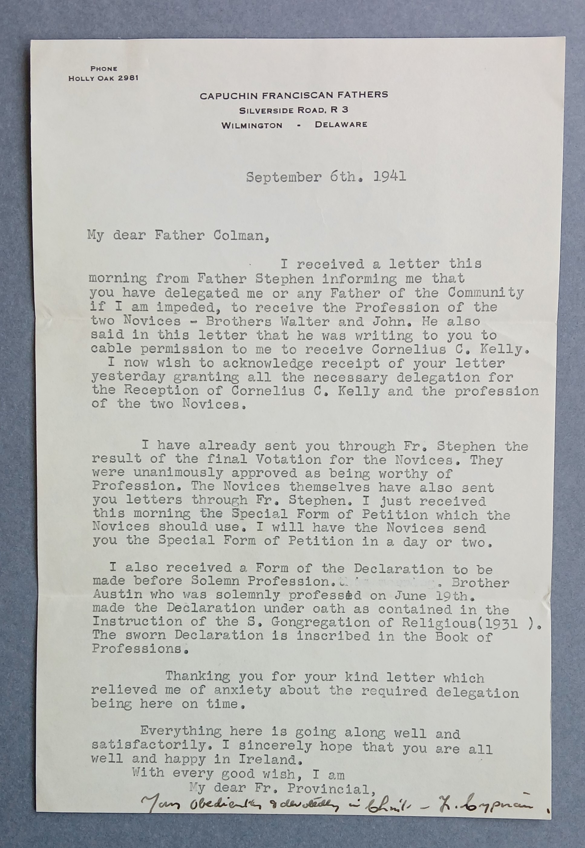 Letter from Fr. Cyprian O’Leary OFM Cap., Wilmington, Delaware, to Fr. Colman Griffin OFM Cap. affirming that he has received the ‘necessary delegation’ for the formal religious profession (vows) of two novices, Brothers Walter and John. He also refers to the reception of Cornelius C. Kelly.