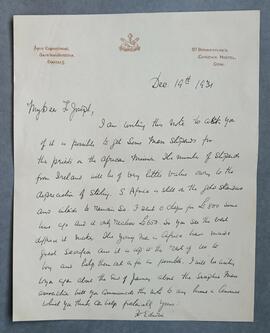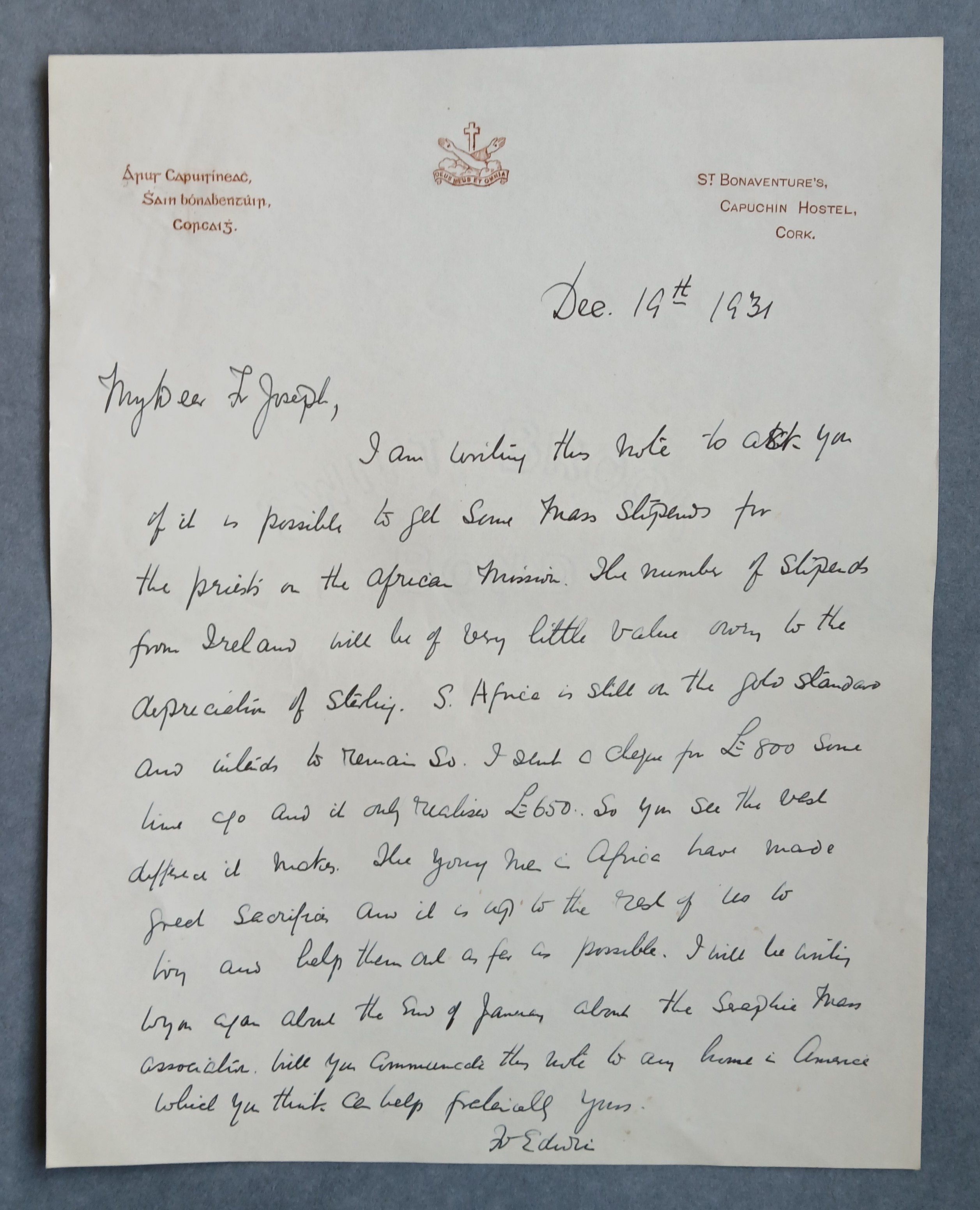 Letter from Fr. Edwin Fitzgibbon OFM Cap., Provincial Minister, to Fr. Joseph Fenelon OFM Cap. on the need for Mass stipends to support Capuchin missionary friars in Africa.