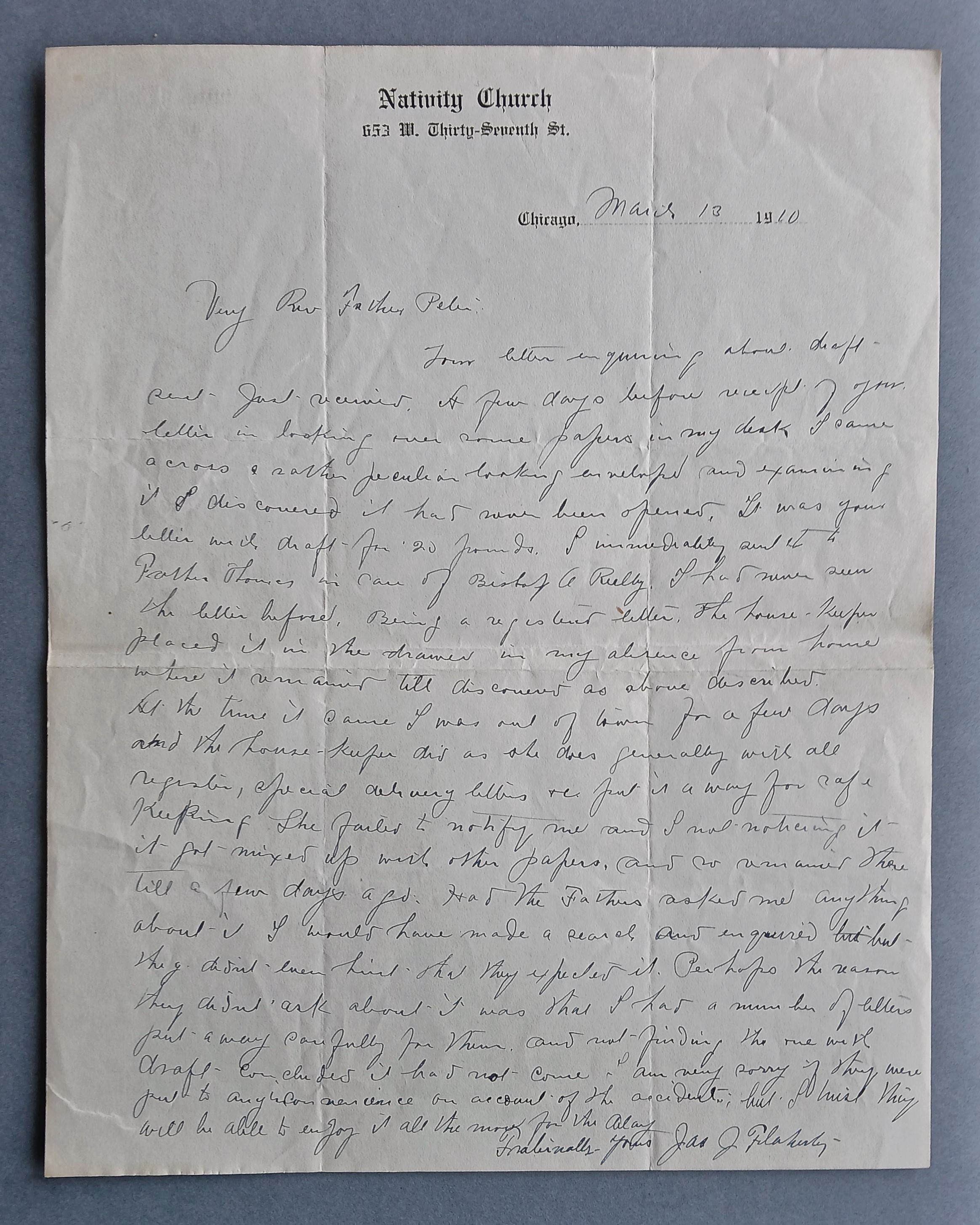 Letter from Fr. James O’Flaherty, Nativity Church, Chicago, to Fr. Peter Bowe OFM Cap., Provincial Minister, apologizing for a significant delay in acknowledging a draft. He confirms that he has immediately forwarded the draft (for £20) to Father Thomas Dowling in the care of Bishop O’Reilly.