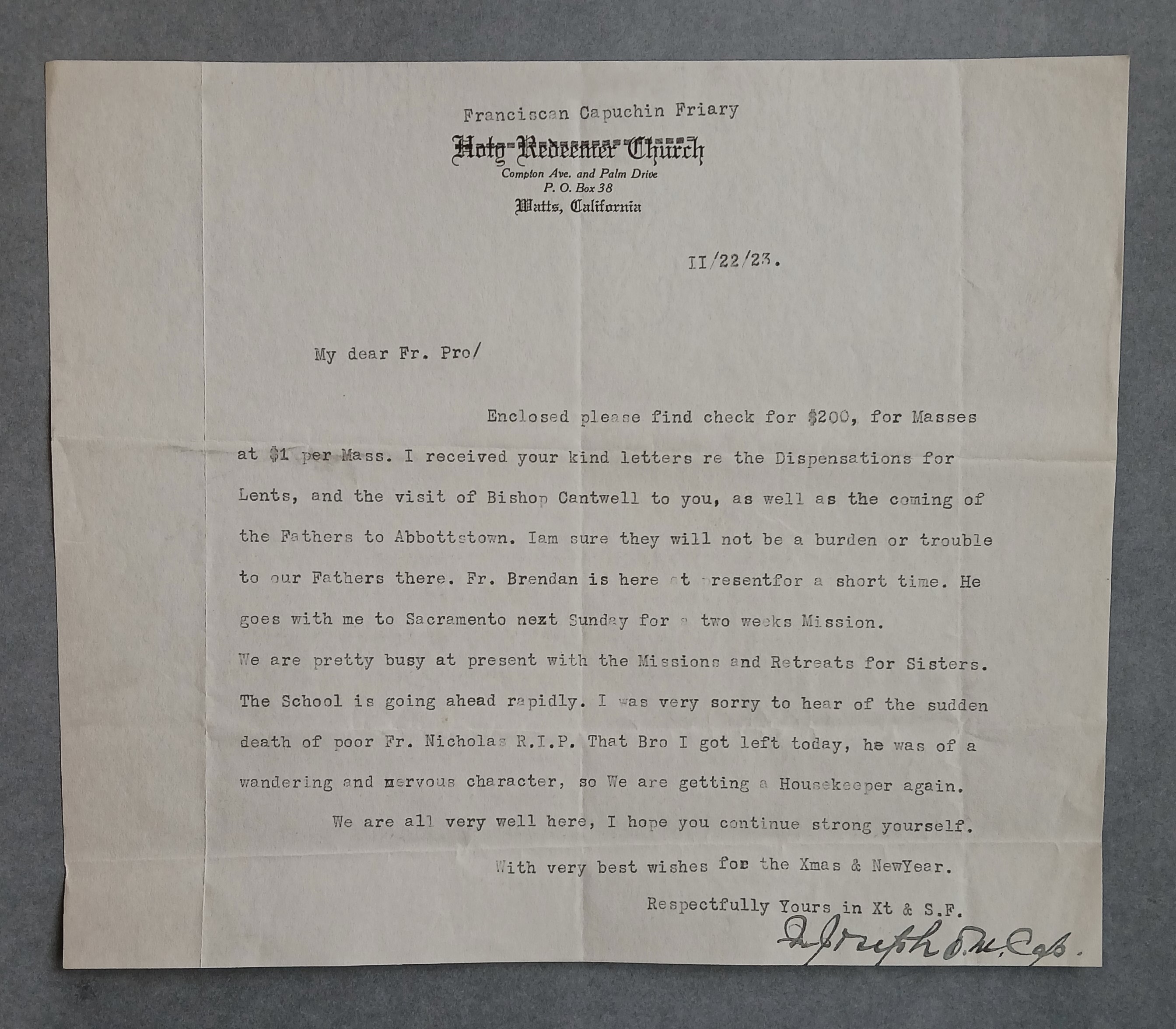 Letter from Fr. Joseph Fenelon OFM Cap. to Fr. Peter Bowe OFM Cap., Provincial Minister, regarding parish and administrative matters. He notes that the construction of the parish school in Watts is moving along rapidly and that the friars are busy conducting Missions and retreats for Sisters. He also refers to the death of Fr. Nicholas Murphy OFM Cap.