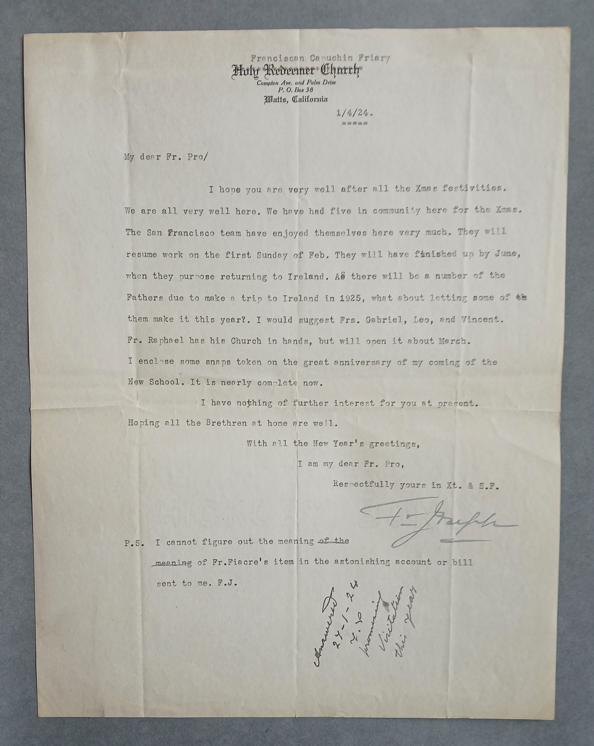 Letter from Fr. Joseph Fenelon OFM Cap. to Fr. Peter Bowe OFM Cap., Provincial Minister, mainly re personnel matters. Father Fenelon notes that some friars will finish their work in June and return to Ireland. He suggests that Fathers Gabriel, Leo, and Vincent should be allowed to make their trip this year (1924) instead of waiting until 1925.