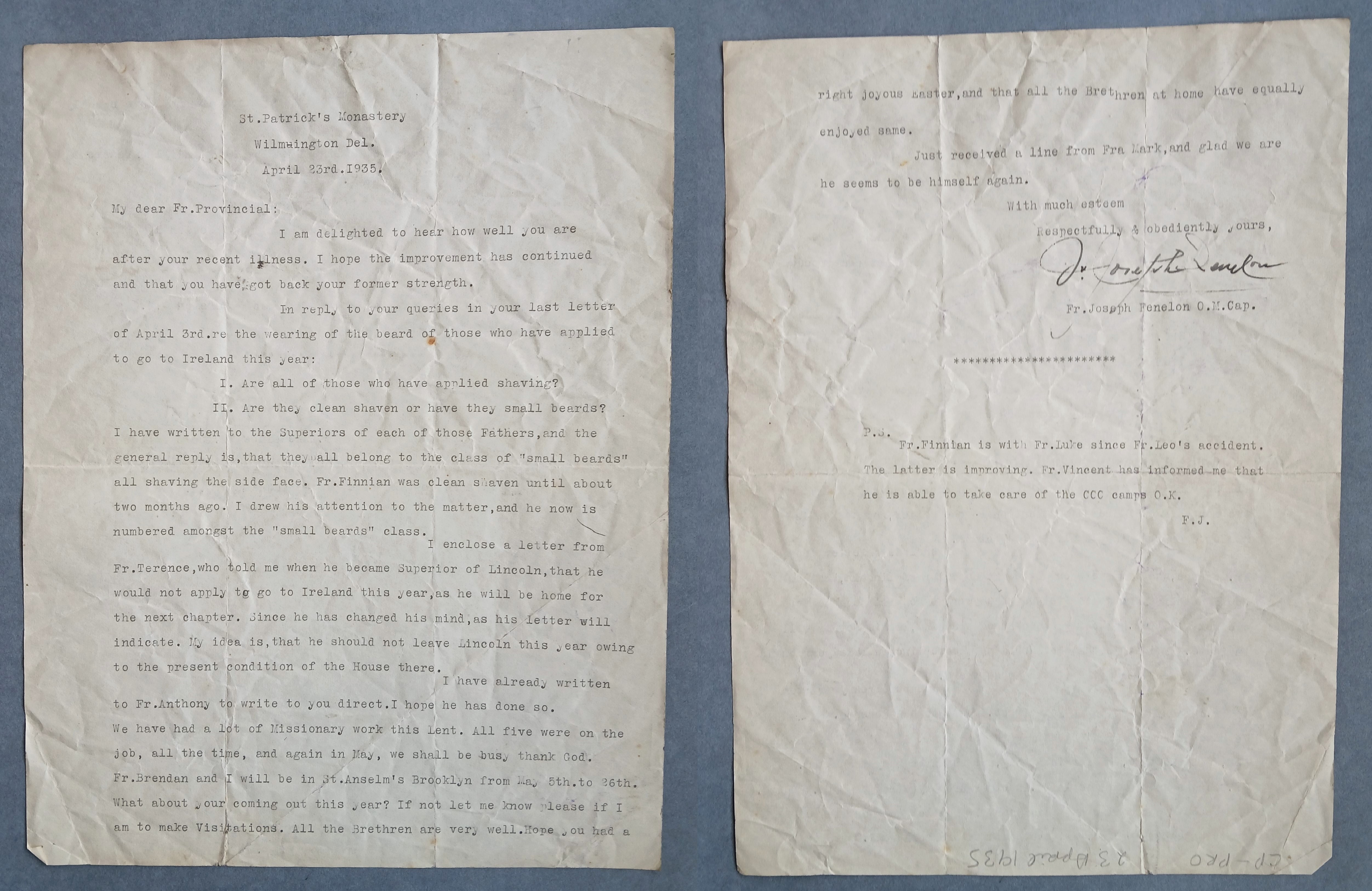 Letter from Fr. Joseph Fenelon OFM Cap. to Fr. Edwin Fitzgibbon OFM Cap., Provincial Minister, referring to the issue of missionary friars wearing bears in the United States. He clarifies that while none of the friars are completely ‘clean shaven’, they have all adopted the style of ‘small beards’ (likely short-trimmed) and are shaving their side faces. Father Fenelon also mentions various personnel changes. Father Fenelon noes that he and Fr. Brendan O’Callaghan will be at St. Anselm’s in Brooklyn from May 5th to the 16th for missionary work.