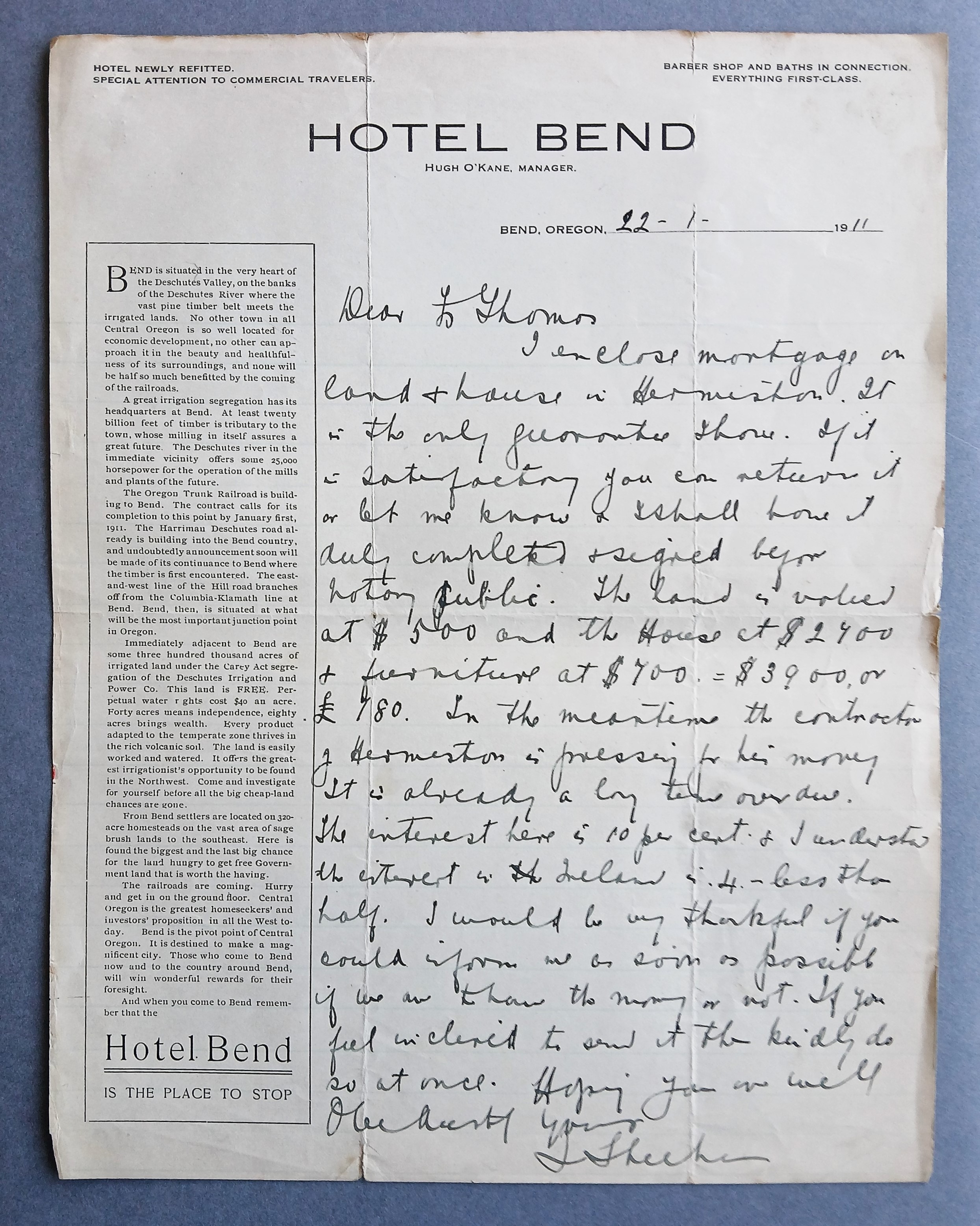 Letter from Fr. Luke Sheehan OFM Cap., Bend, Oregon, to Fr. Thomas Dowling OFM Cap., Provincial Minister, regarding a pressing mortgage and financial debt in Hermiston, Oregon. He explains that the contractor in Hermiston is ‘pressing for his money’ and that the payment is significantly delayed.