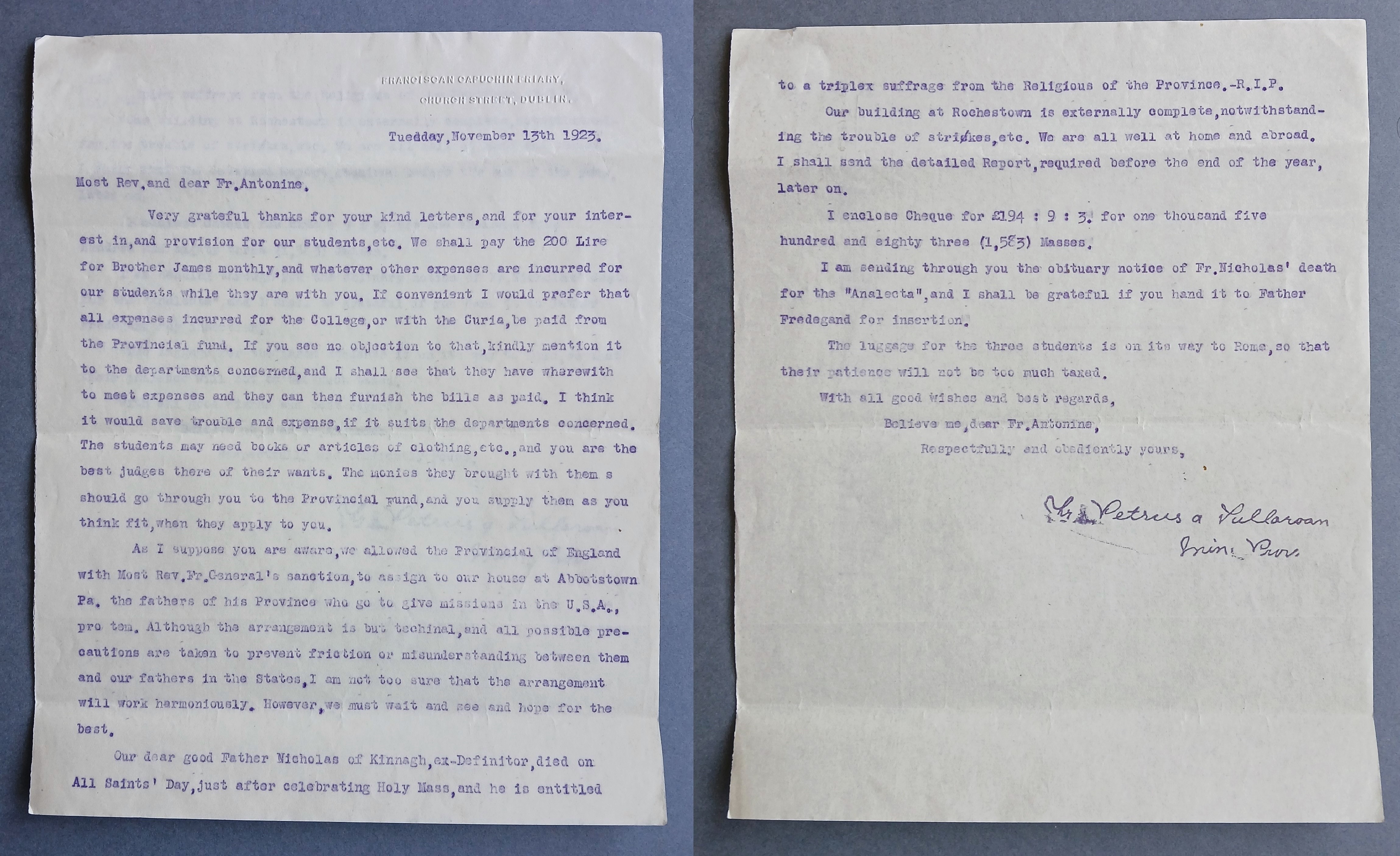 Letter from Fr. Peter Bowe OFM Cap., Provincial Minister, to Fr. Antonine Wilmer OFM Cap. expressing his gratitude for the care provided to Irish Capuchin students in Rome. He agrees to pay 200 Lire monthly for Brother James O’Mahony and requests that all college and Curia expenses be billed directly to the Provincial Fund to simplify bookkeeping. The letter references an agreement sanctioned by the Father General allowing the English Provincial to send friars to the Irish headquarters at Abbottstown, Pennsylvania. Fr. Peter admits he is ‘not too sure that the arrangement will work harmoniously’ but hopes for the best, noting that precautions have been taken to avoid friction. Father Peter reports the death of Fr. Nicholas Murphy, an ex-Definitor, who died on All Saints’ Day after celebrating Mass. He requests that an obituary notice be placed in the ‘Analecta’ (the Order’s official periodical).