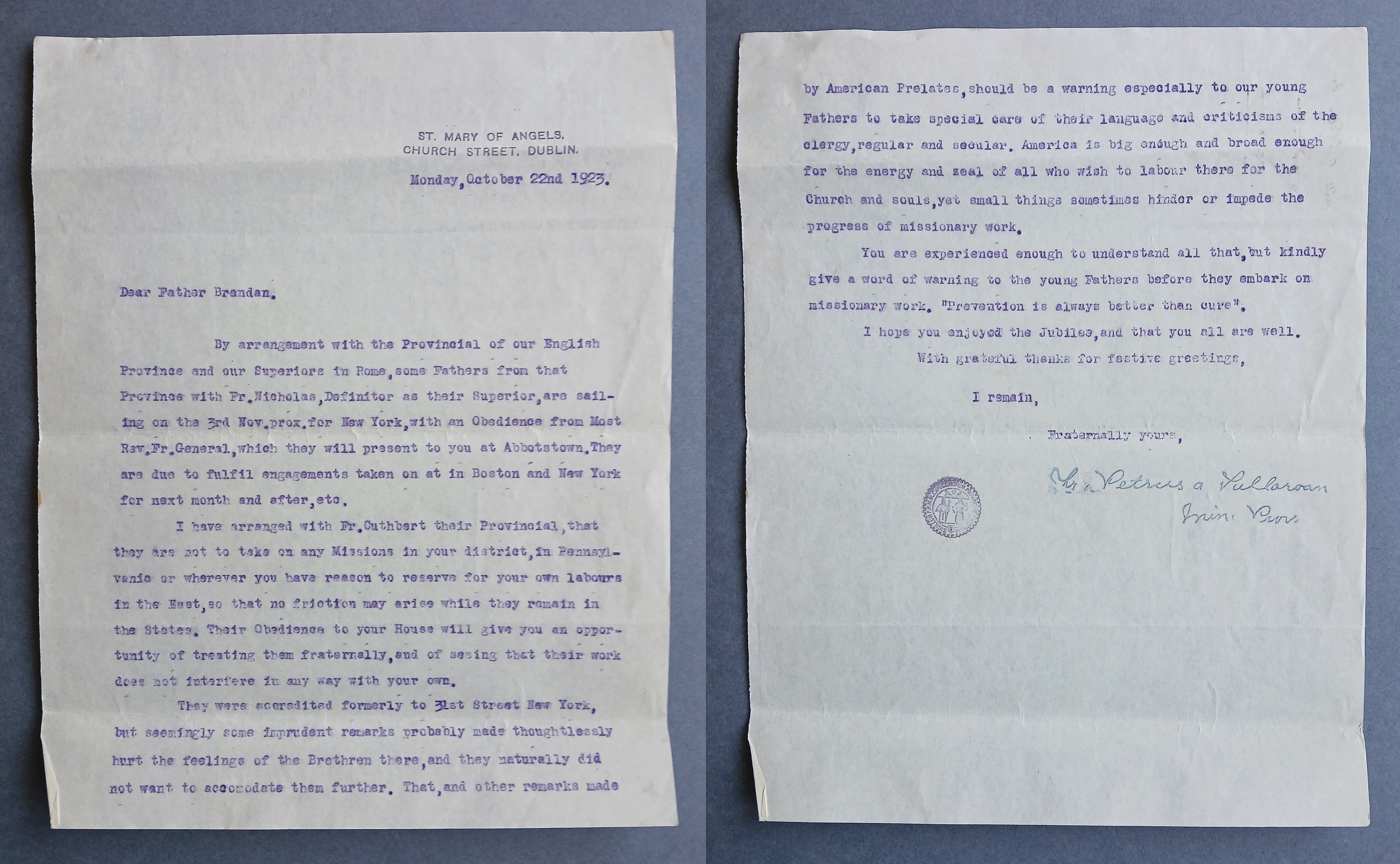 Letter from Fr. Peter Bowe OFM Cap., Provincial Minister, to Fr. Brendan O’Callaghan OFM Cap. announcing that by arrangement with the English Provincial (Fr. Cuthbert Hess) and Rome, a group of English friars led by Fr. Nicholas is sailing for New York on 3 November. They will report to the Irish house at Abbottstown, Pennsylvania. Father Peter has secured a formal agreement from the English Provincial that their friars will not take on missions in Pennsylvania or any other district the Irish Province intends to reserve for its own work. He requests that Fr. Brendan warn younger Irish friars to be circumspect in their speech. He notes that ‘American Prelates’ have taken offense at criticisms made by visiting clergy, and emphasizes that ‘America is big enough and broad enough’ for everyone if small, hindering behaviours are avoided.