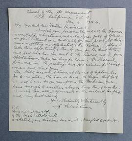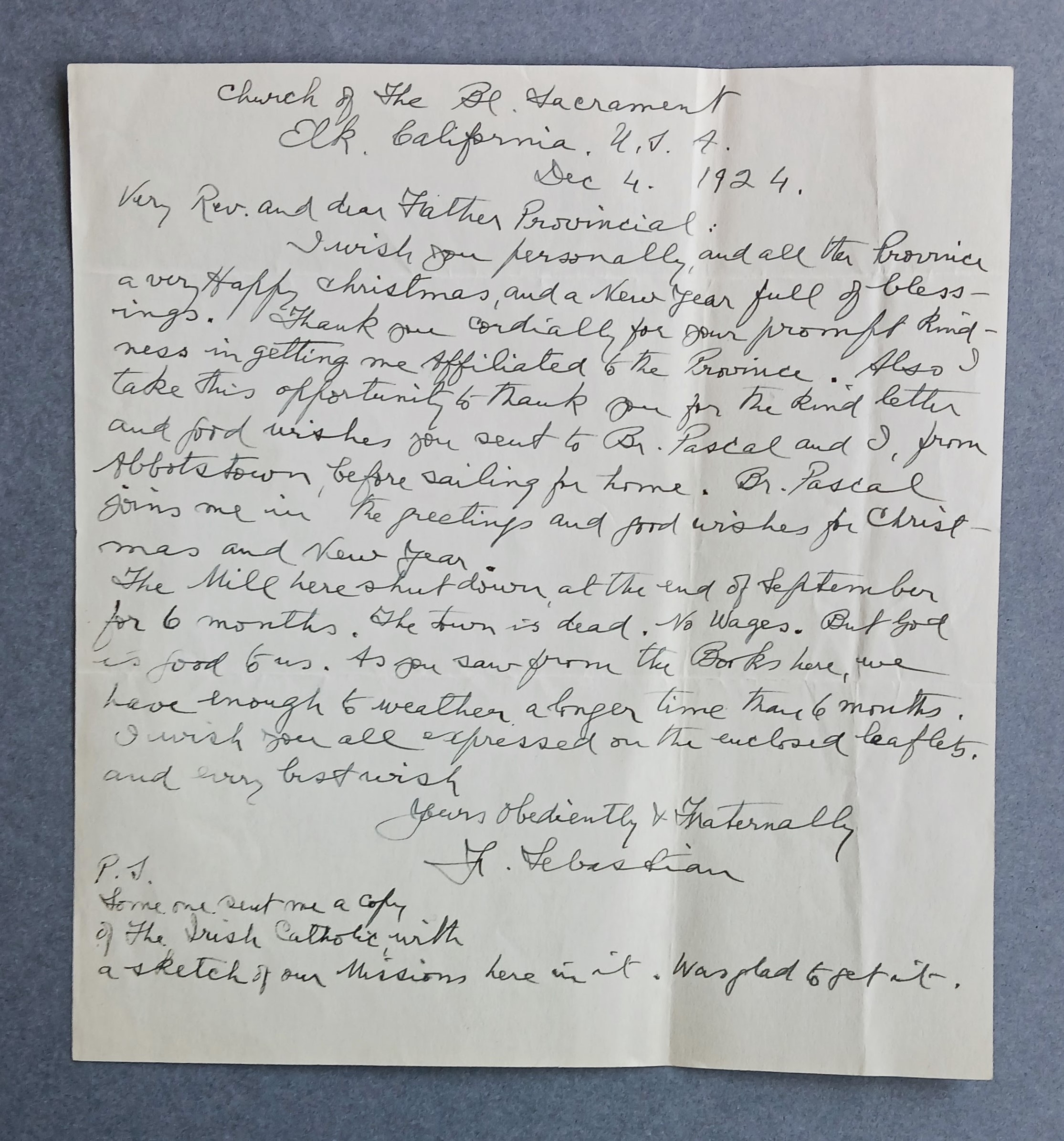 Letter Fr. Sebastian Brennan OFM Cap., Church of the Blessed Sacrament, Elk, California, to Fr. Peter Bowe OFM Cap., Provincial Minister, expresses his deep gratitude for ‘getting me affiliated to the Province’. Father Sebastian notes that the mill in Elk will shut down at the end of September for six months, stating, ‘The town is dead. No Wages’.
