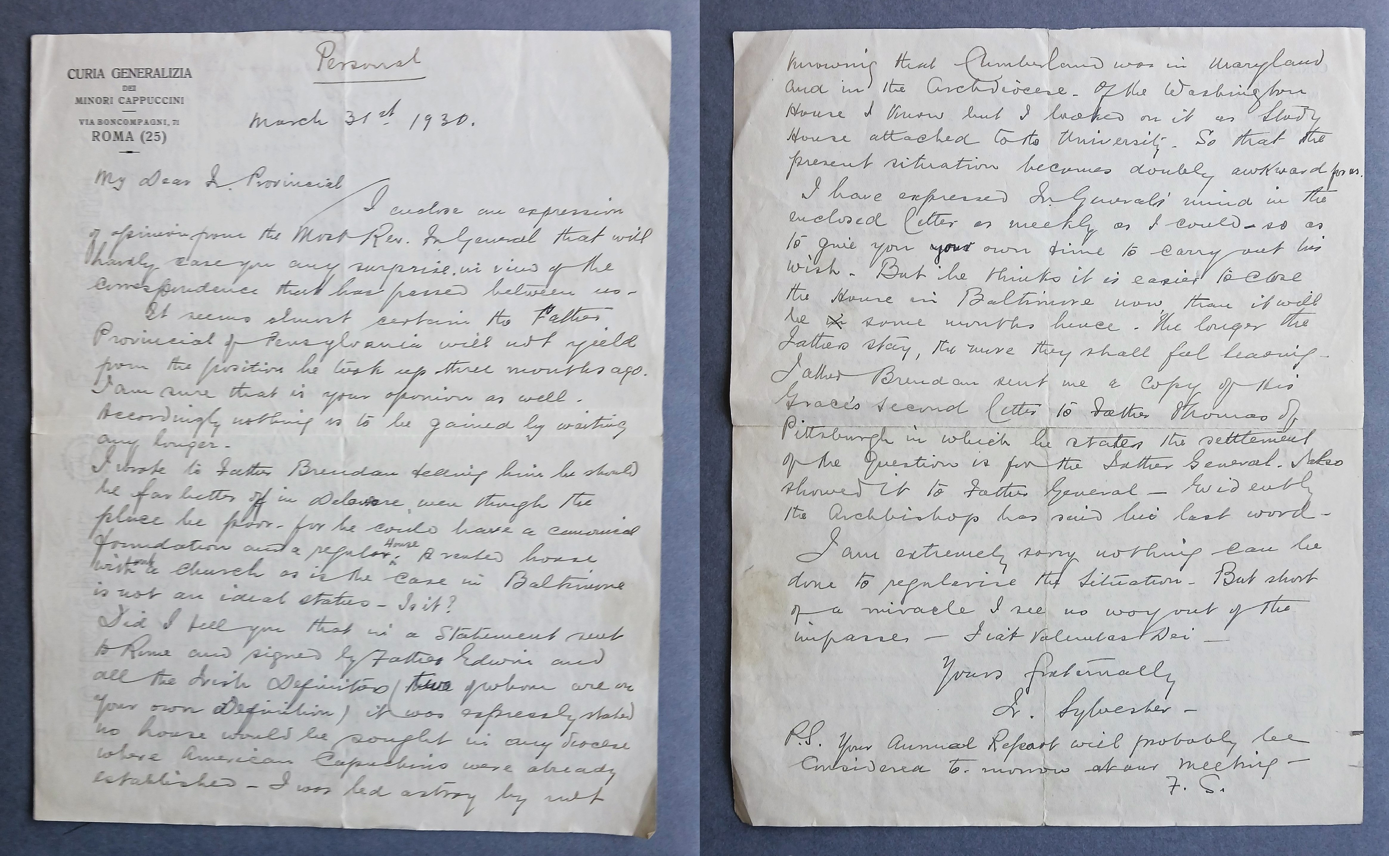 Letter from Fr. Sylvester Mulligan OFM Cap., Definitor General, to Fr. Kevin Moynihan OFM Cap., Provincial Minister, referring to the unyielding position taken by the Capuchin superior in Pennsylvania. Fr. Sylvester states that he has written to Fr. Brendan O’Callaghan OFM Cap. suggesting that he ‘should be far better off in Delaware, even though the place be poor, for he could have a canonical foundation and a regular house …’. He also suggests that ‘it is easier to close the house in Baltimore now, than it will be some month’s hence’.