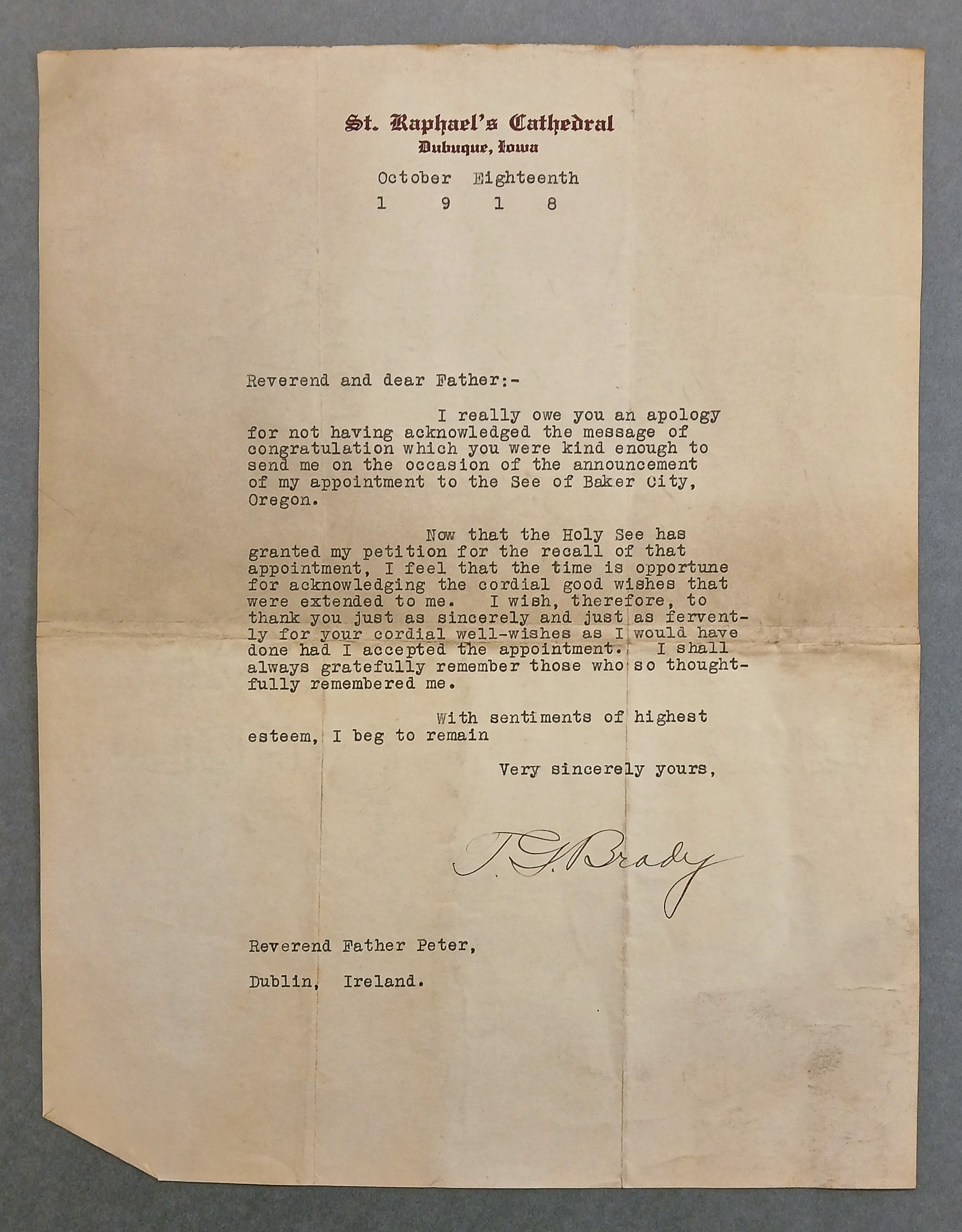 In July 1918, Pope Benedict XV named Terrence G. Brady of the Archdiocese of Dubuque, Iowa, as the next bishop of Baker City. However, Brady declined the appointment.
