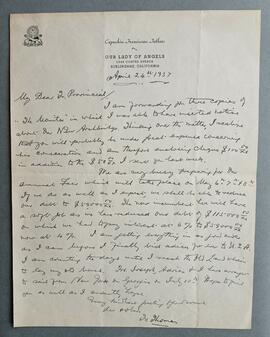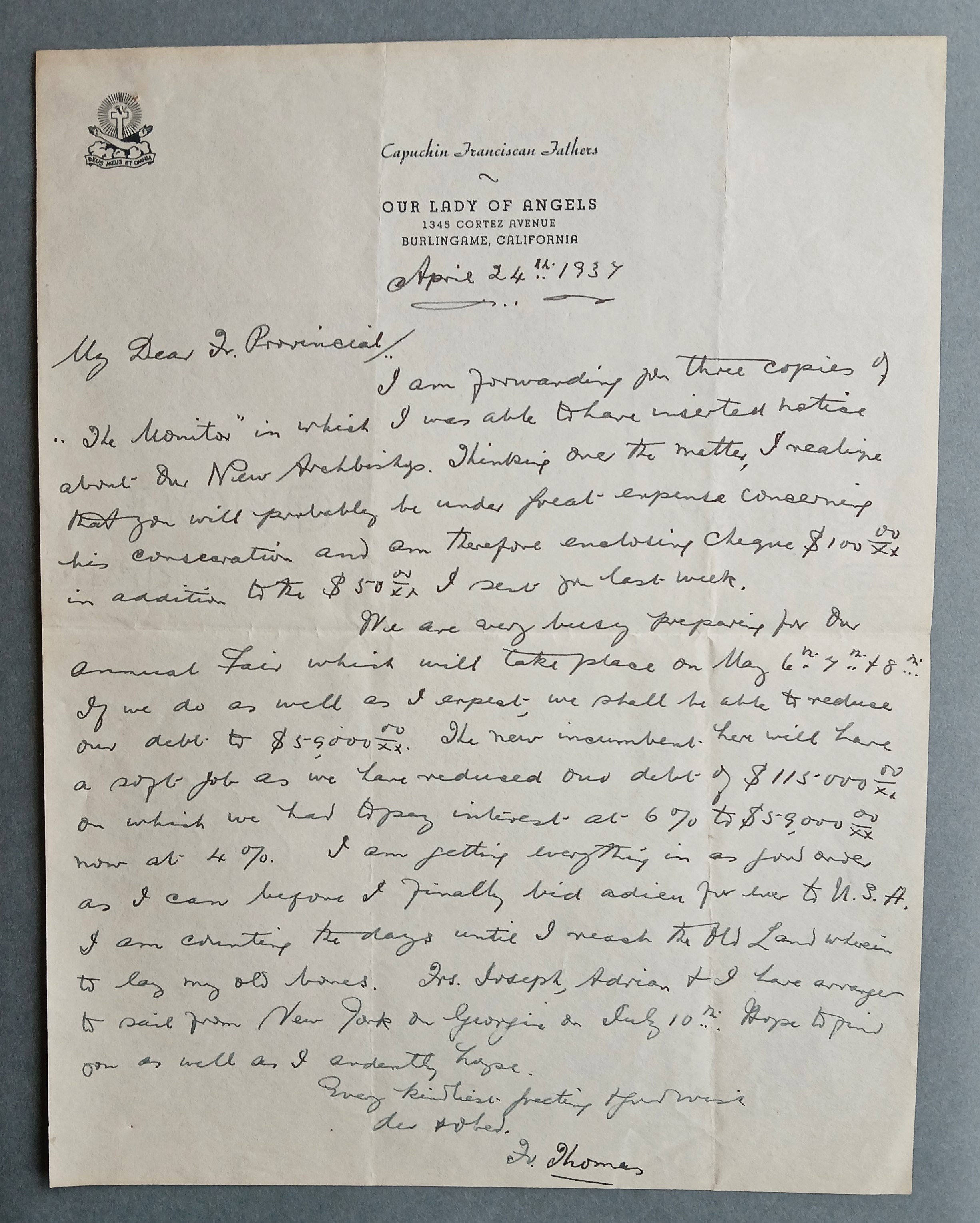Letter from Fr. Thomas Dowling OFM Cap., Our Lady of Angels, Burlingame, California, to Fr. Edwin Fitzgibbon OFM Cap., Provincial Minister, on preparation for the annual fair. He also mentions that the debt on the church and residence in Burlingame has been reduced to $59,000. He adds ‘I am getting everything in as good order as I can before I finally bid adieu for ever to U.S.A. I am counting the days until I reach the old land wherein to lay my old bones. Frs. Joseph, Adrian and I have arranged to sail from New York on “Georgic” on July 10th’.