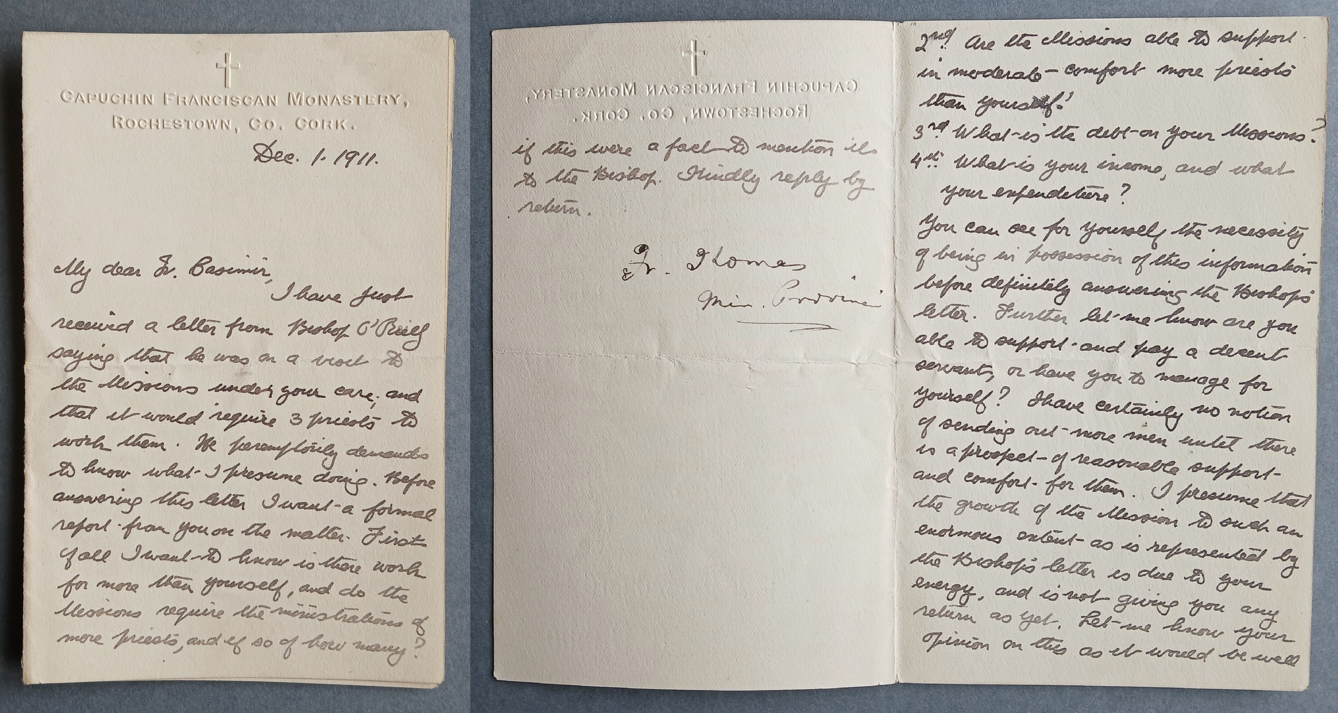 Letter from Fr. Thomas Dowling OFM Cap., Provincial Minister, to Fr. Casimir Butler OFM Cap. seeking information on the personnel and financial requirements for the Oregon mission.