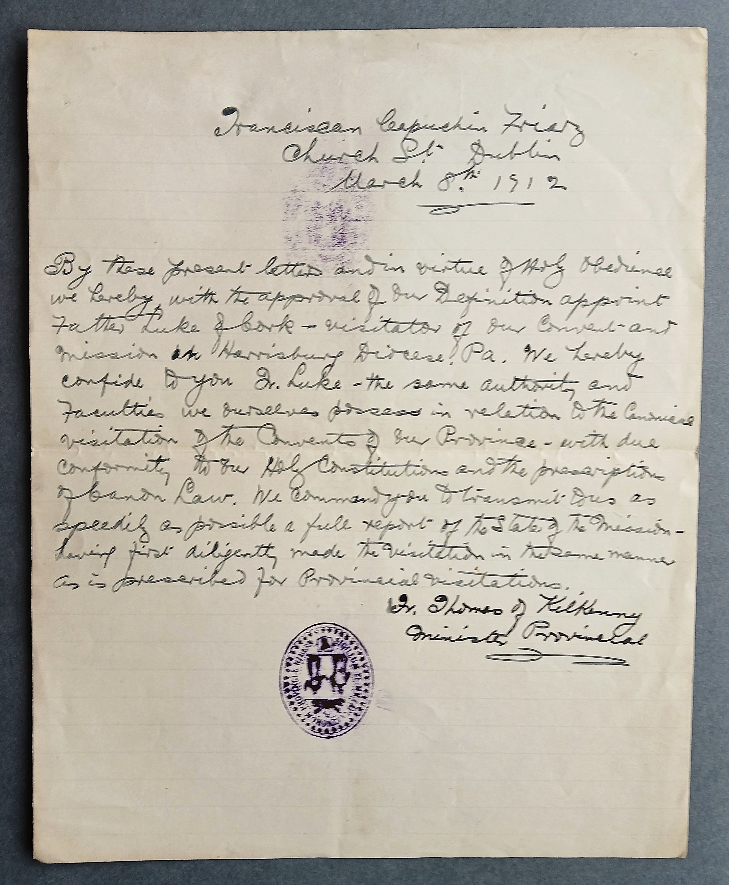 Letter from Fr. Thomas Dowling OFM Cap., Provincial Minister, appointing Fr. Luke Sheehan OFM Cap. as visitator of the convent and mission in the the Harrisburg Diocese in Pennsylvania.