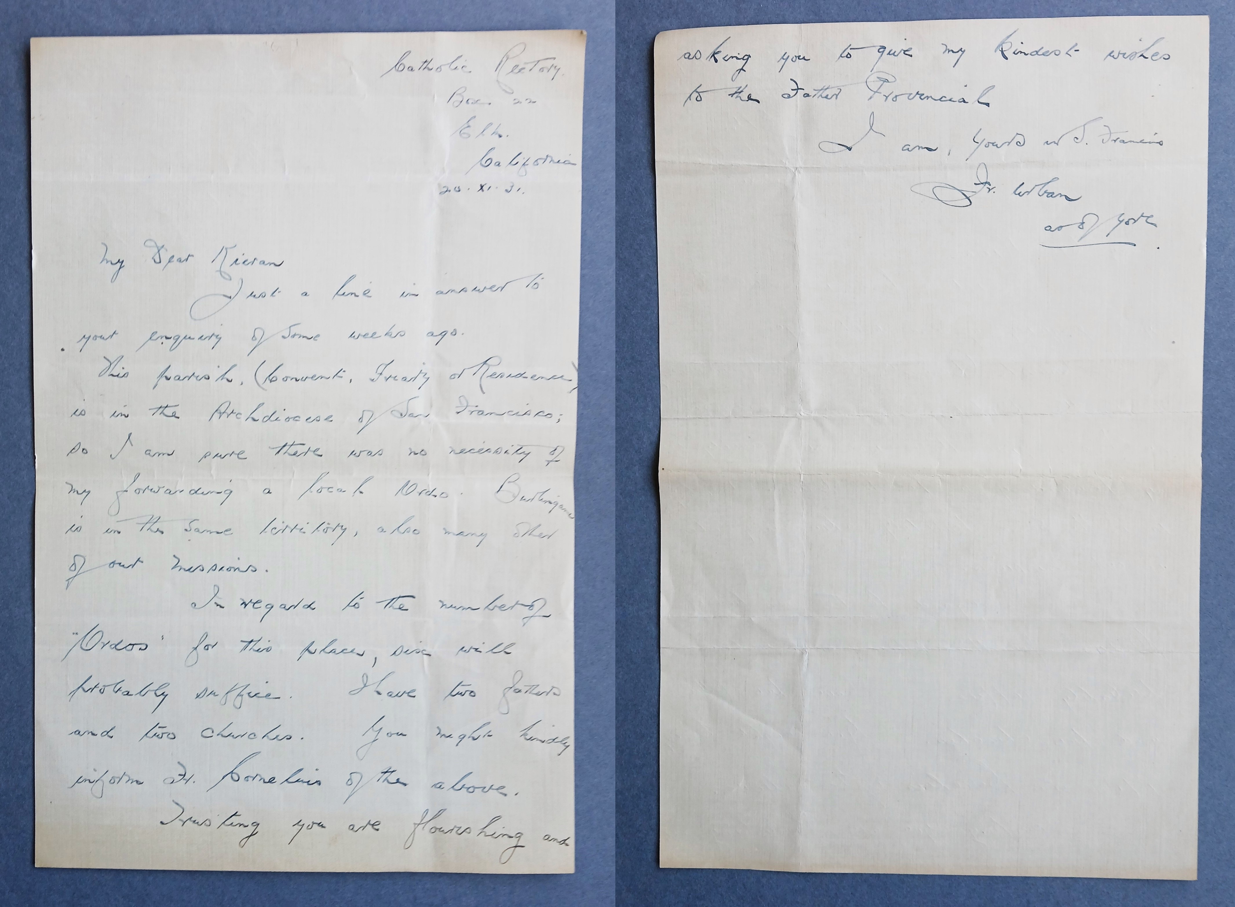 Letter from Fr. Urban Riordan OFM Cap., Catholic Rectory, Elk, California, to Fr. Kieran O’Callaghan OFM Cap., Provincial Secretary, on the number of copies of the ‘Ordo’ which he may require.