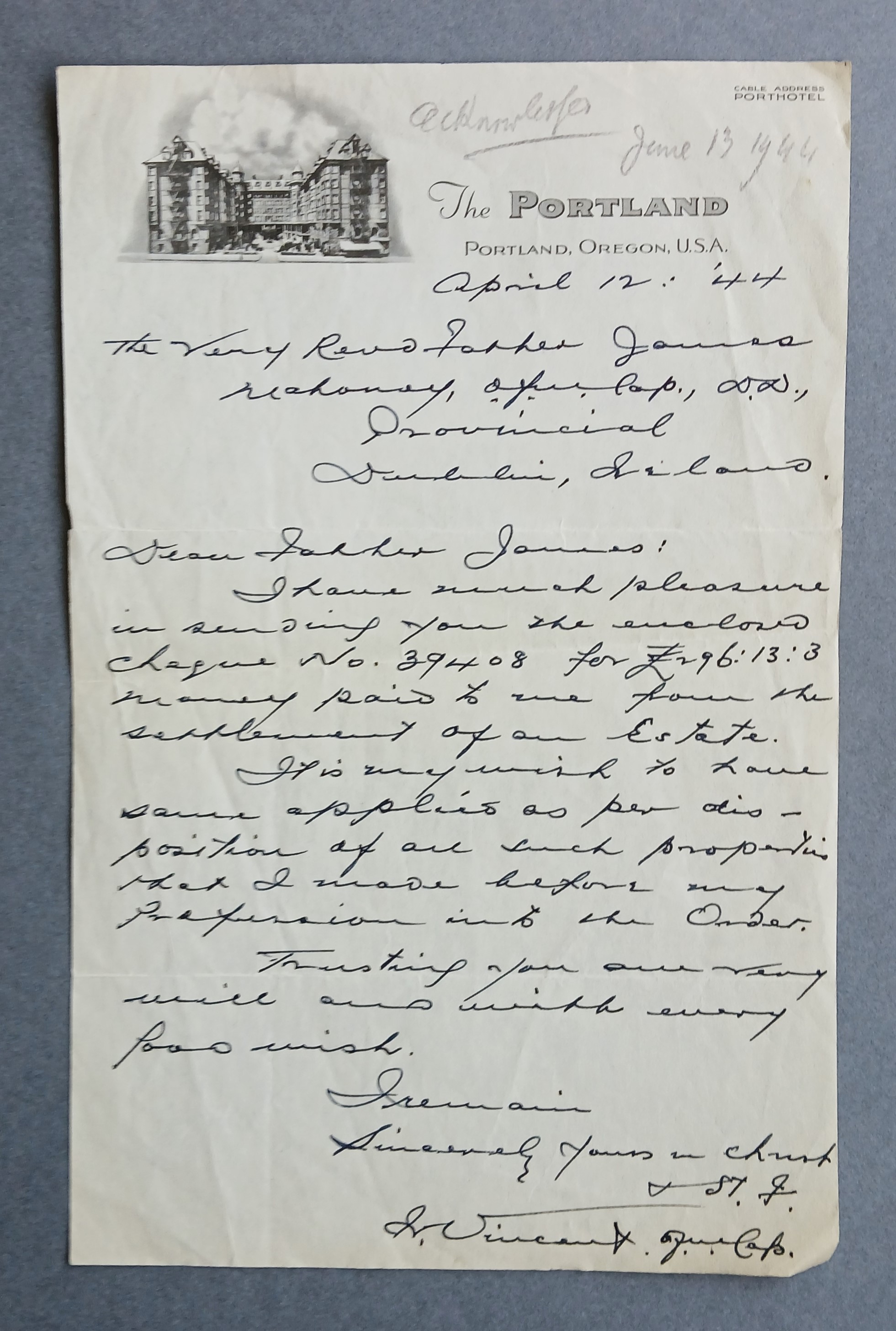Letter from Fr. Vincent Kerwick OFM Cap. to Fr. James O’Mahony OFM Cap., Provincial Minister, mentioned that he has received money from the ‘settlement of an Estate’ and forwards a cheque for £96 13s 3d.