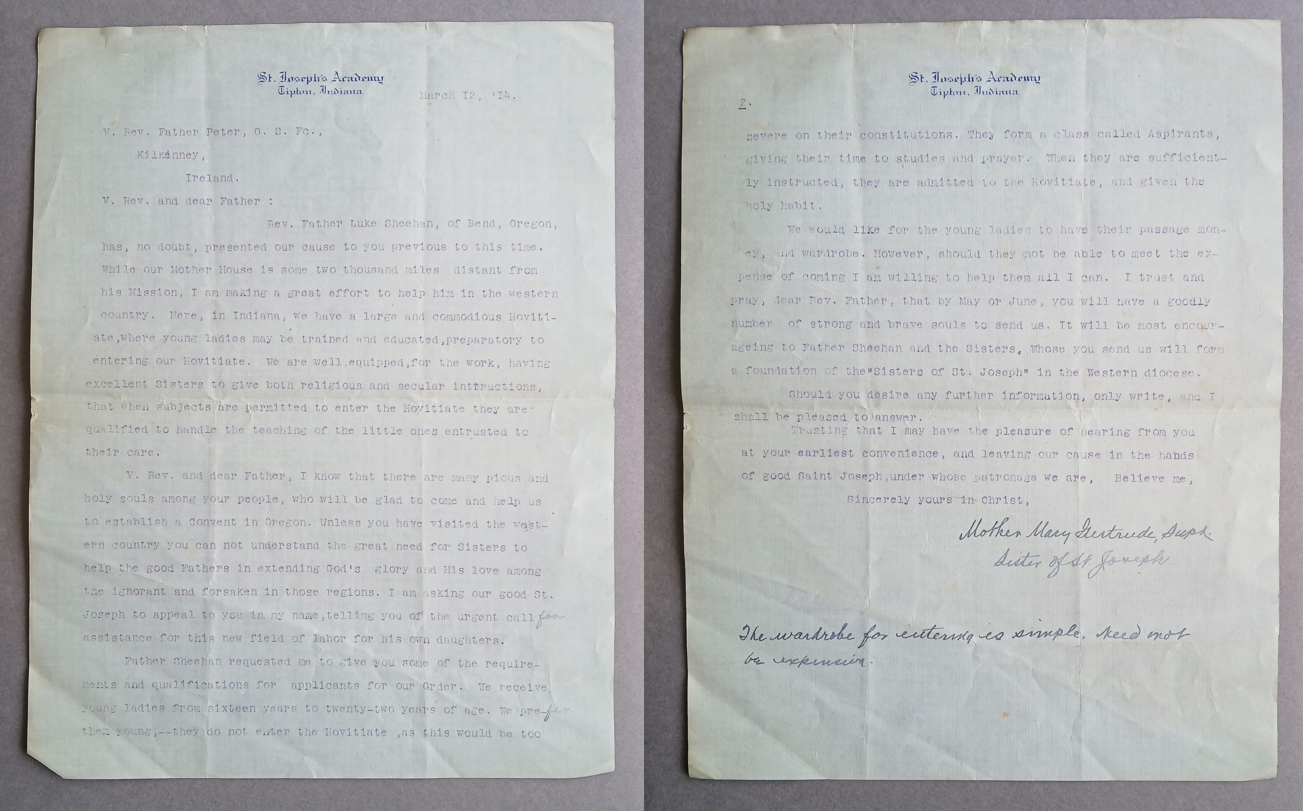 Letter from Mother Mary Gertrude, Mother Superior, St. Joseph’s Academy, Tipton, Indiana, to Fr. Peter Bowe OFM Cap., Provincial Minister. She explains that she met Fr. Luke Sheehan on a ship from Ireland in 1908, and he has since written to her ‘making a great effort’ to get sisters to help his mission. Mother Gertrude proposes a plan to recruit young women from Ireland to join their order specifically to serve the Oregon mission. She describes their ‘young and flourishing institute’ in Indiana where these young women could be trained in religious and secular subjects before entering the novitiate.