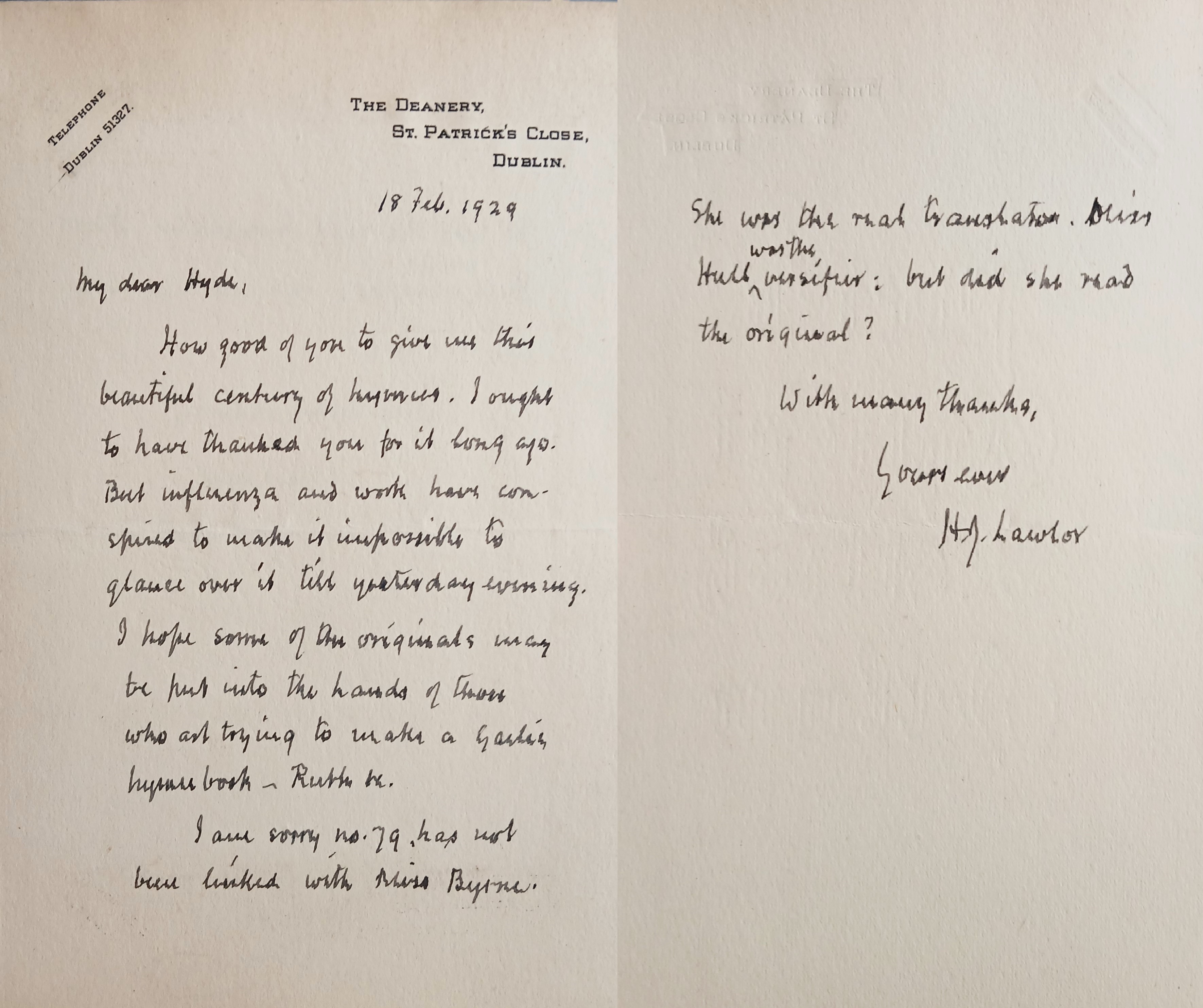 Letter from Rev. Hugh Jackson Lawlor to Douglas Hyde