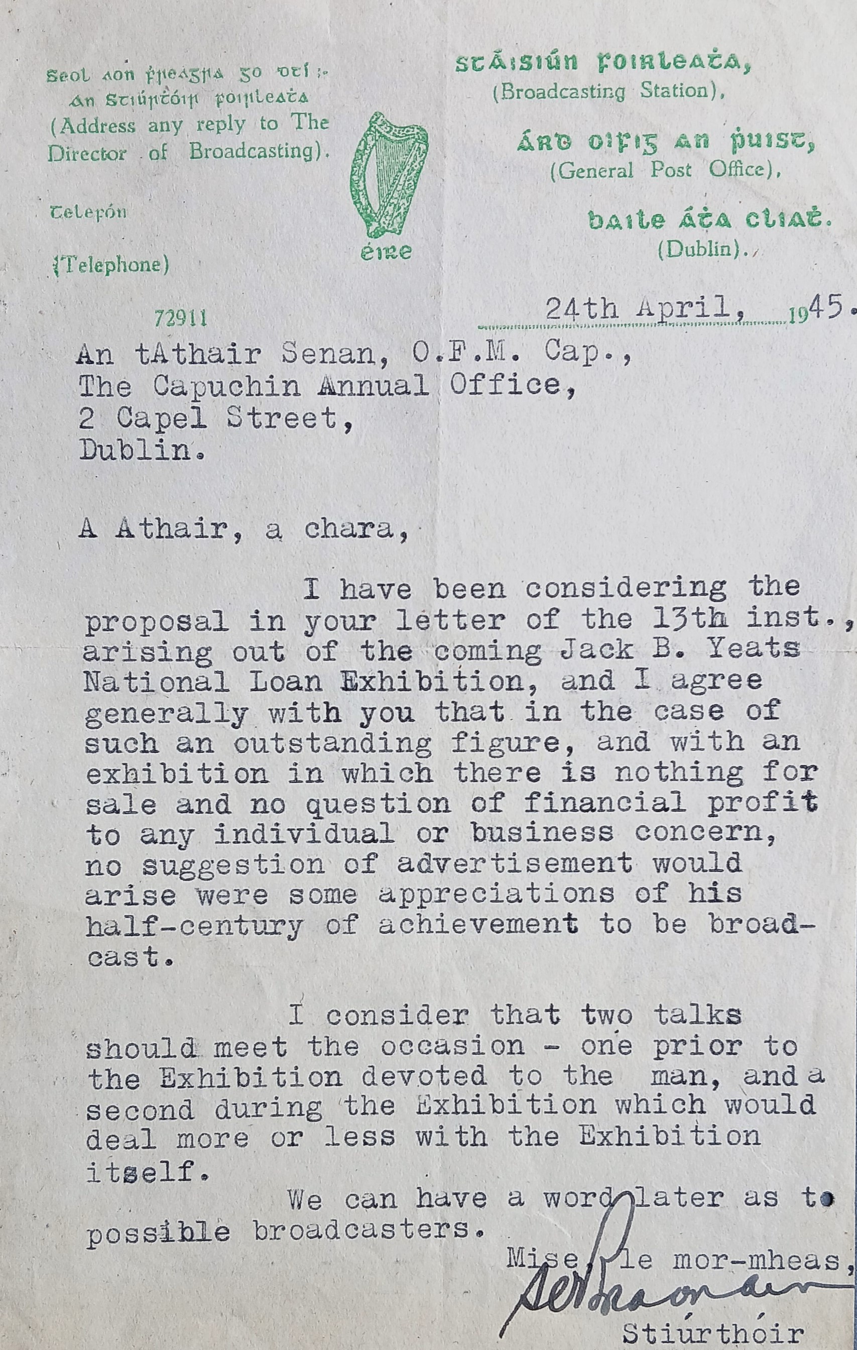 A letter from Séamus Ó Braonáin to Fr. Senan Moynihan OFM Cap. regarding the potential of radio broadcasts devoted to Jack B. Yeats and the National Loan Exhibition of his paintings.