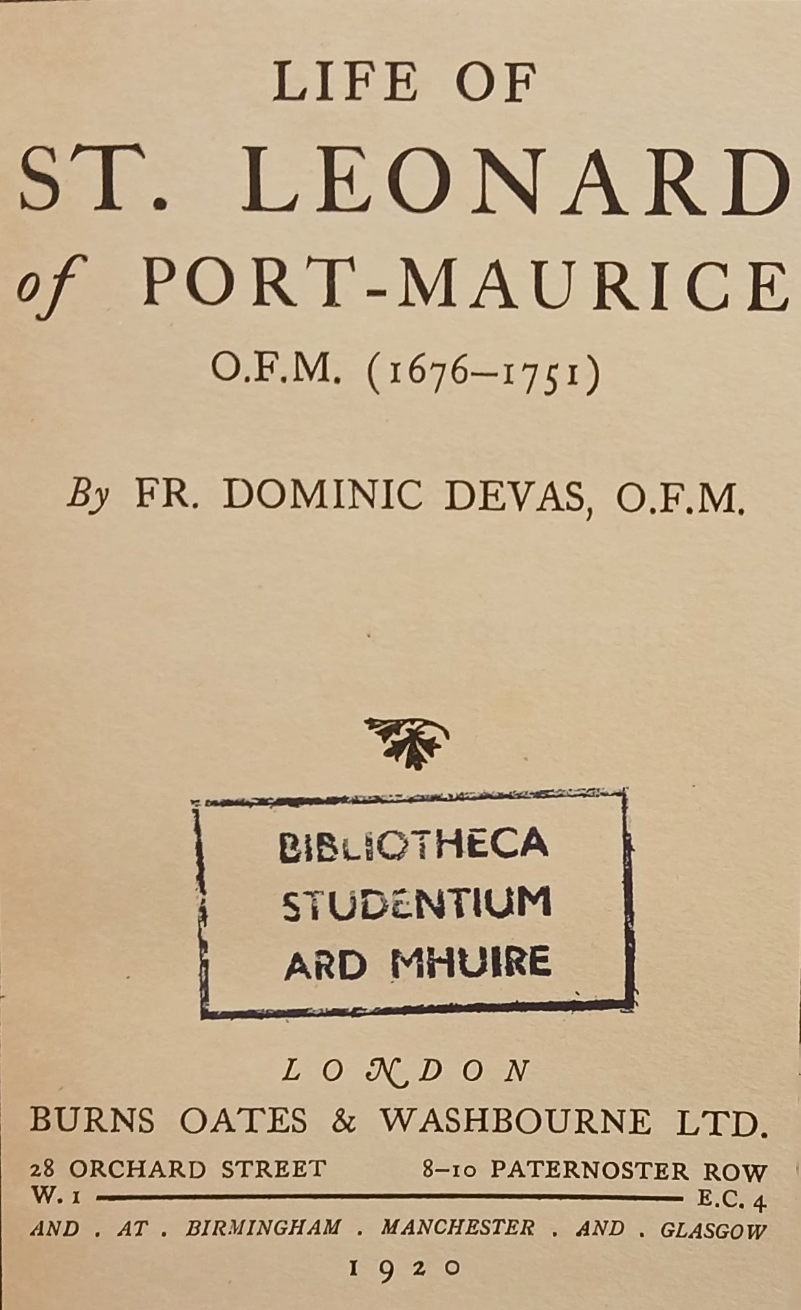A copy of Fr. Dominic Devas OFM, ‘Life of Saint Leonard of Port-Maurice OFM (1676-1751)’ (London: Burns, Oates & Washborne, 1920).