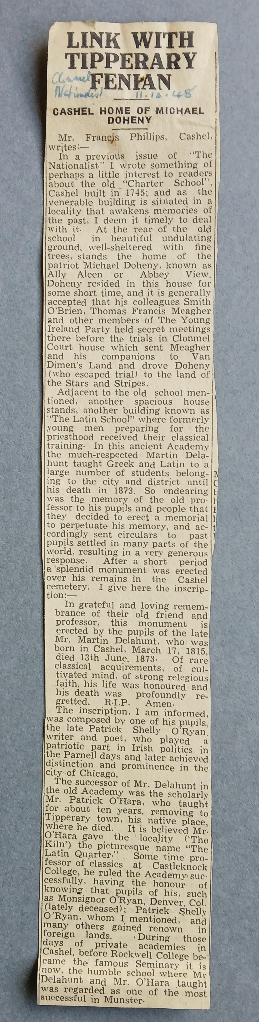 A clipping of an article titled ‘Link with Tipperary Fenian / Cashel home of Michael Doheny’ taken from ‘The Nationalist’ (11 December 1948).