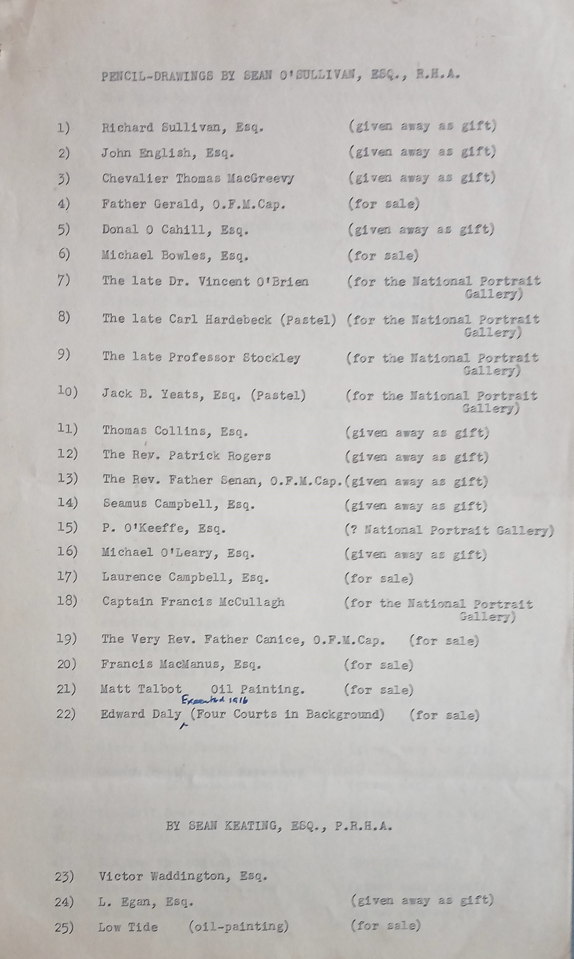 A list of artworks seemingly held in the Capuchin Publications Office in Dublin. The listing includes the titles of work and notes indicating whether the item was gifted, donated to the National Gallery of Ireland, or is ‘for sale’. Includes paintings and sketches by Seán O’Sullivan RHA, Seán Keating, Michael Healy, Jack B. Yeats, Patrick Tuohy, Grace Henry, Paul Henry, Somhairle McCann, J. Humbert Craig, Maurice MacGonigal, Fr. Jack Hanlon, Hary Kernoff, W.J. Leech, Carmel Flynn, Seán O’Connor, James G. Brennan, Richard King, Constance Markievicz, and others.