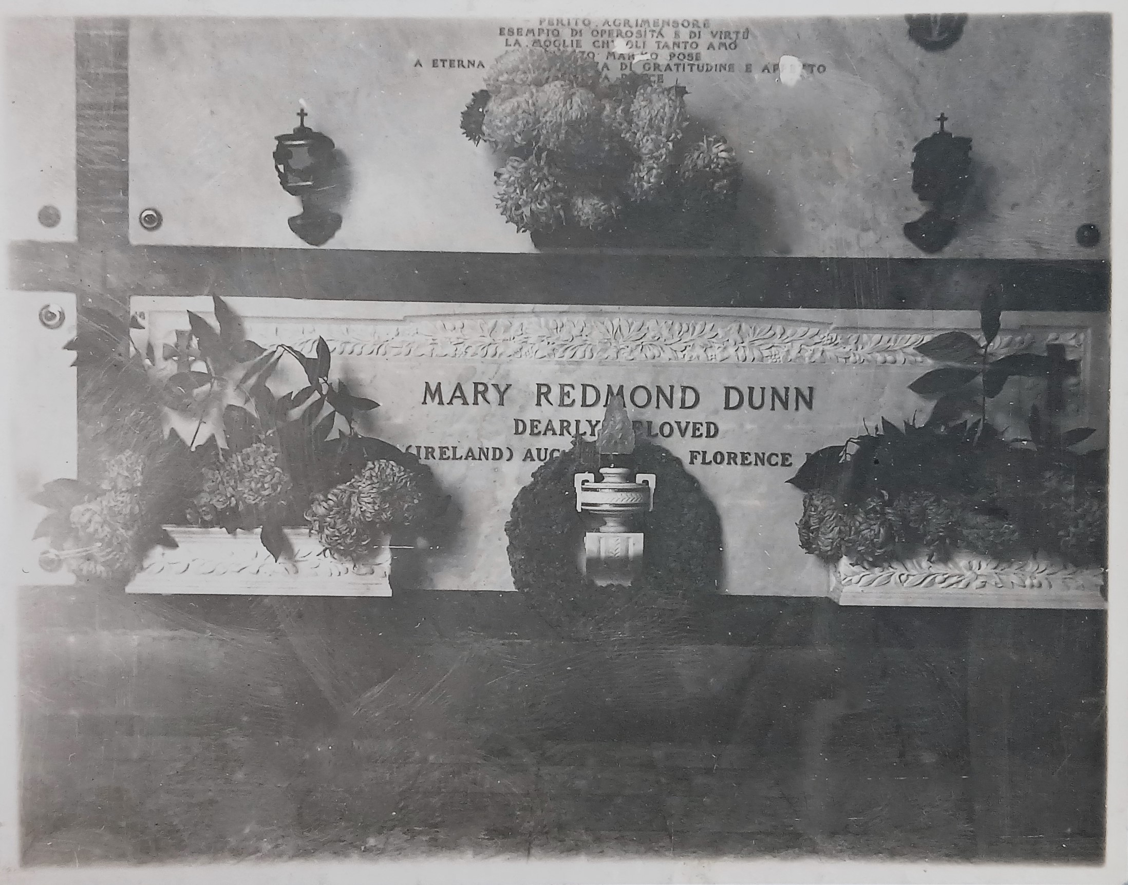 An image of the grave of the Irish sculptor Mary Redmond in Florence. Several annotations are exaton the reverse of the print. They read ‘Santa Lucia al Galluzzo, Firenze / 16th Jan. 1930 died / 15th March 1893 married / 14 August 1863 born / Mary Redmond’s grave in Florence’.