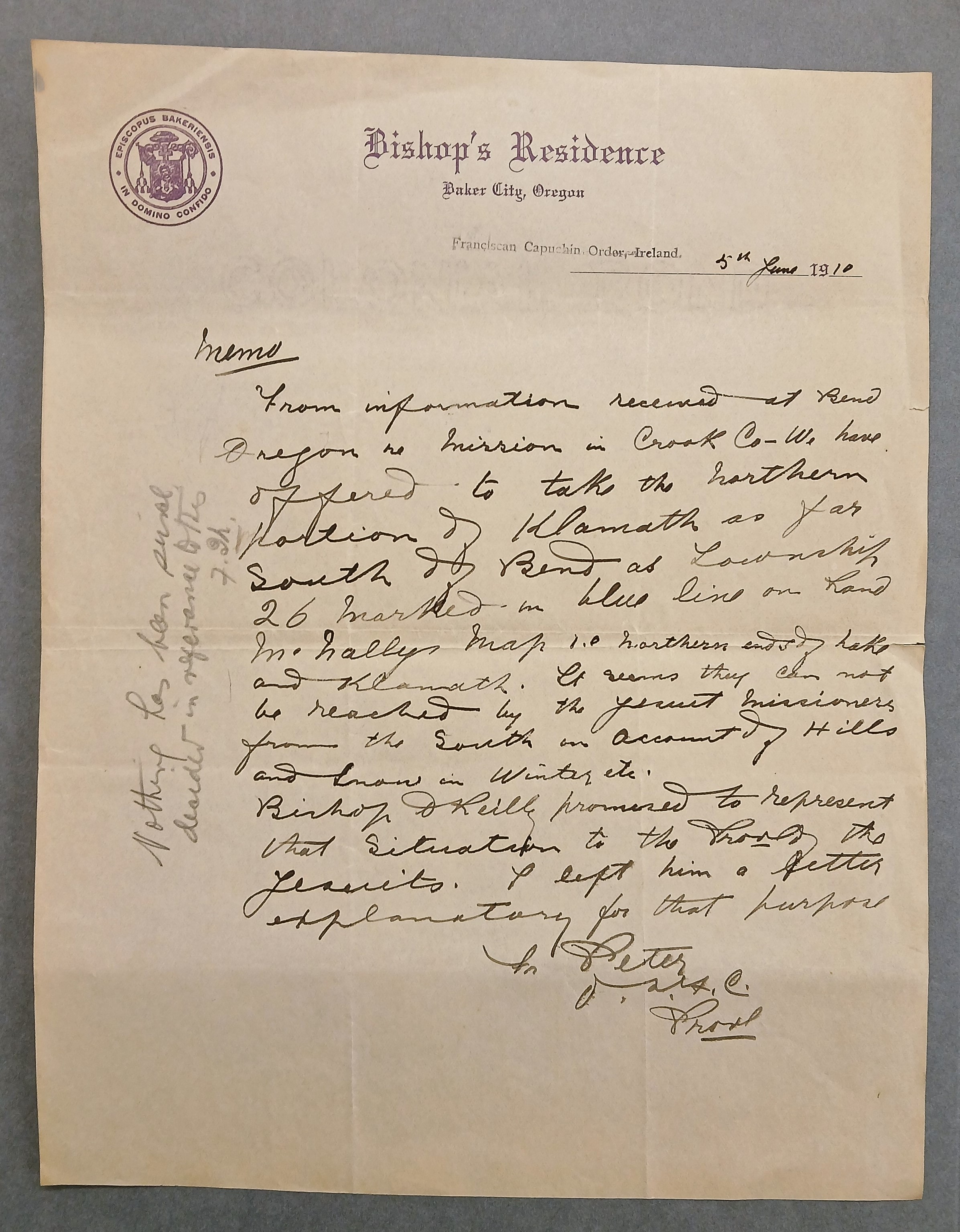 A memorandum from Fr. Peter Bowe OFM Cap., Provincial Minister, regarding the boundaries of the Capuchin mission around Bend in Oregon. Father Peter reports on information received at Bend, Oregon regarding a mission in Crook County. The Irish Capuchins have offered to take responsibility for the ‘northern portion of Klamath’ as far south of Bend as ‘Township 26’.