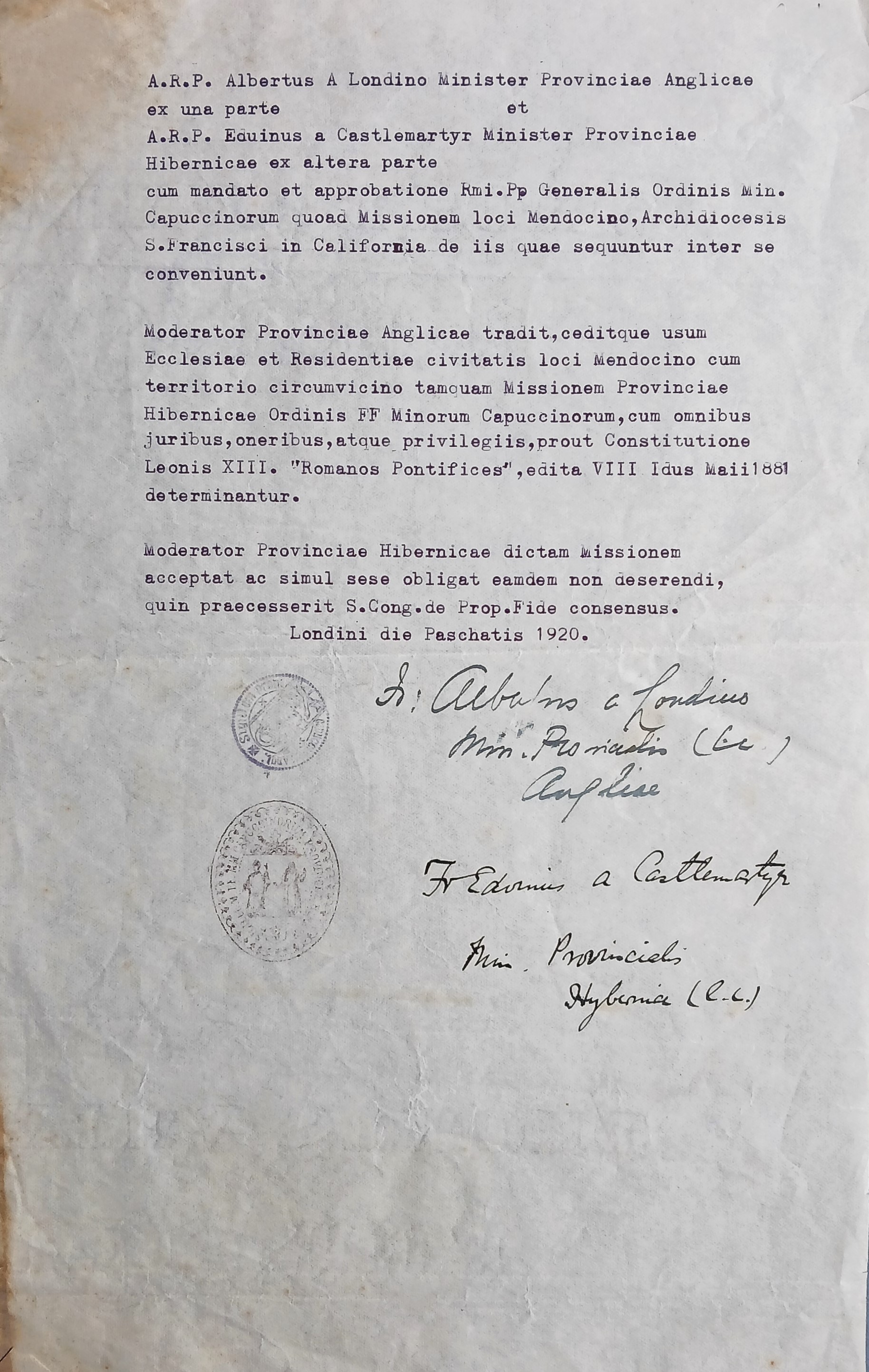 Memorandum of agreement from regarding the transfer of a Catholic mission in Mendocino, California, from the English Capuchin Province to the Irish Capuchin Province. The agreement is signed by Fr. Edwin Fitzgibbon OFM Cap., Provincial Minister of the Irish Capuchins and Fr. Albert of London, for the English Capuchin Province. The Irish Provincial Minister formally accepts the mission and obligates the province not to abandon it without the prior consensus of the Sacred Congregation for the Propagation of the Faith.
