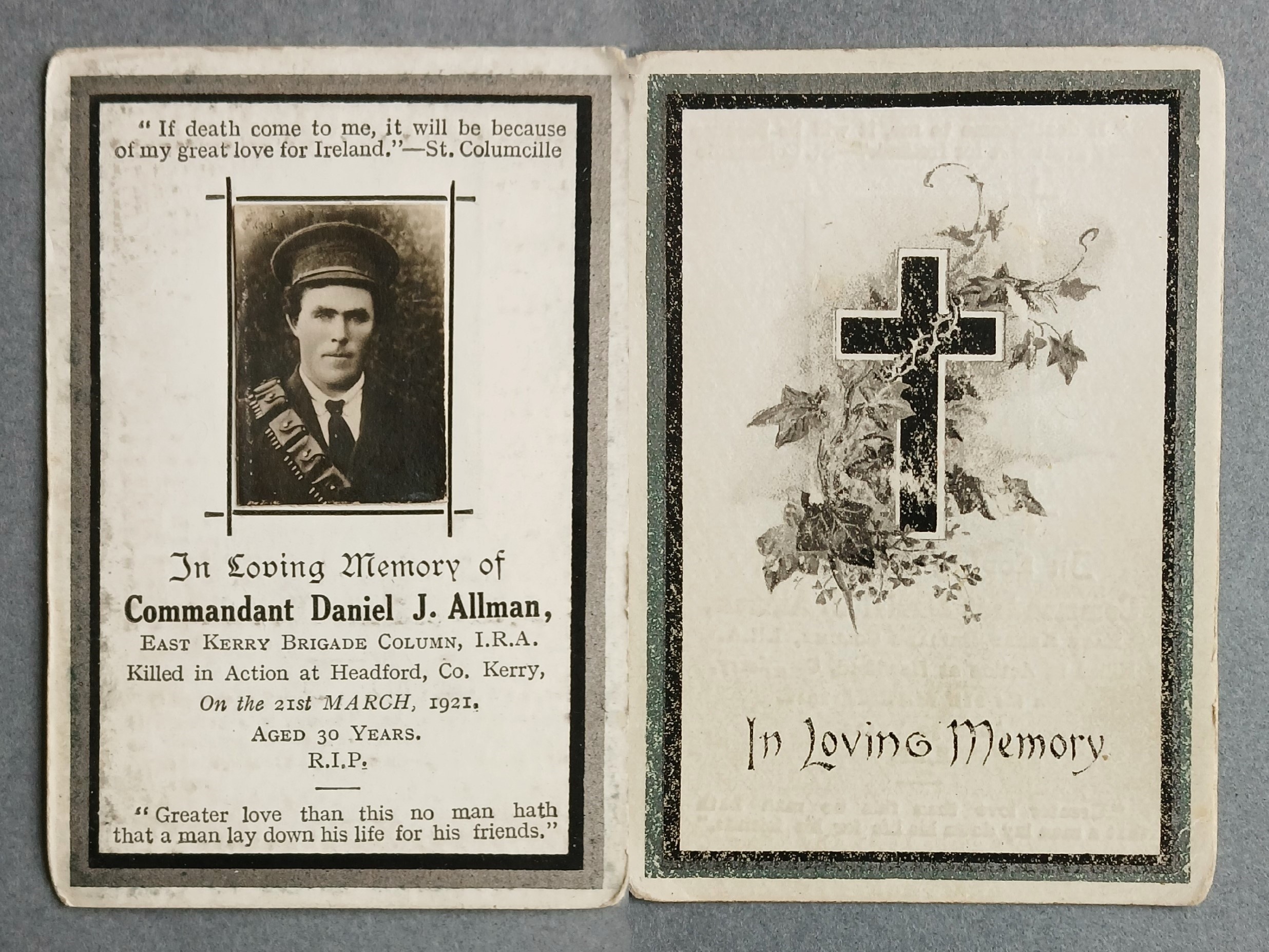 A memorial card Commandant Daniel J. Allman who was ‘killed in action at Headford, Co. Kerry on the 21st March 1921’.
