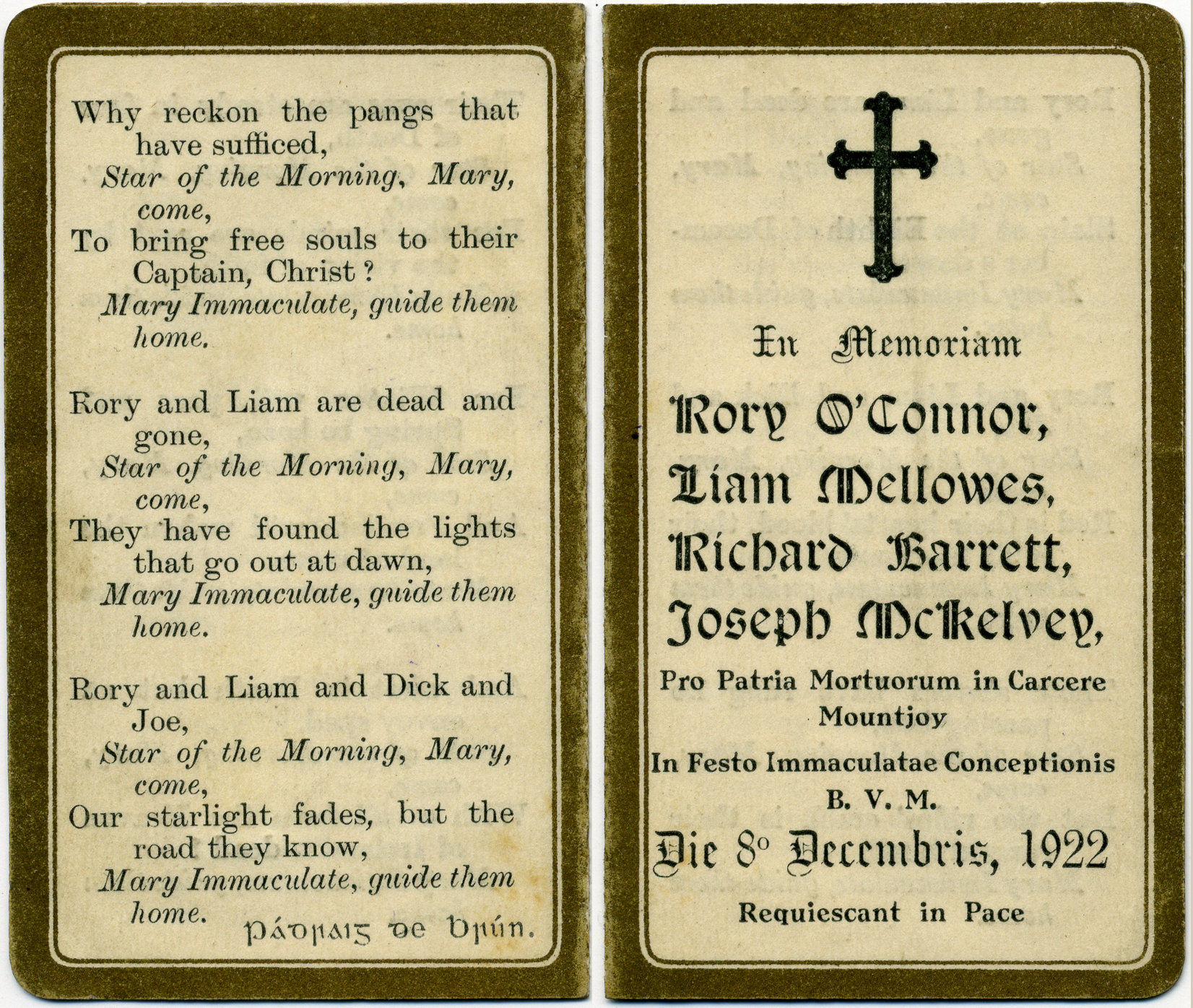 A memorial card for Rory O’Connor, Liam Mellows, Richard Barrett, and Joseph McKelvey who were executed in Mountjoy Jail in Dublin on 8 December 1922