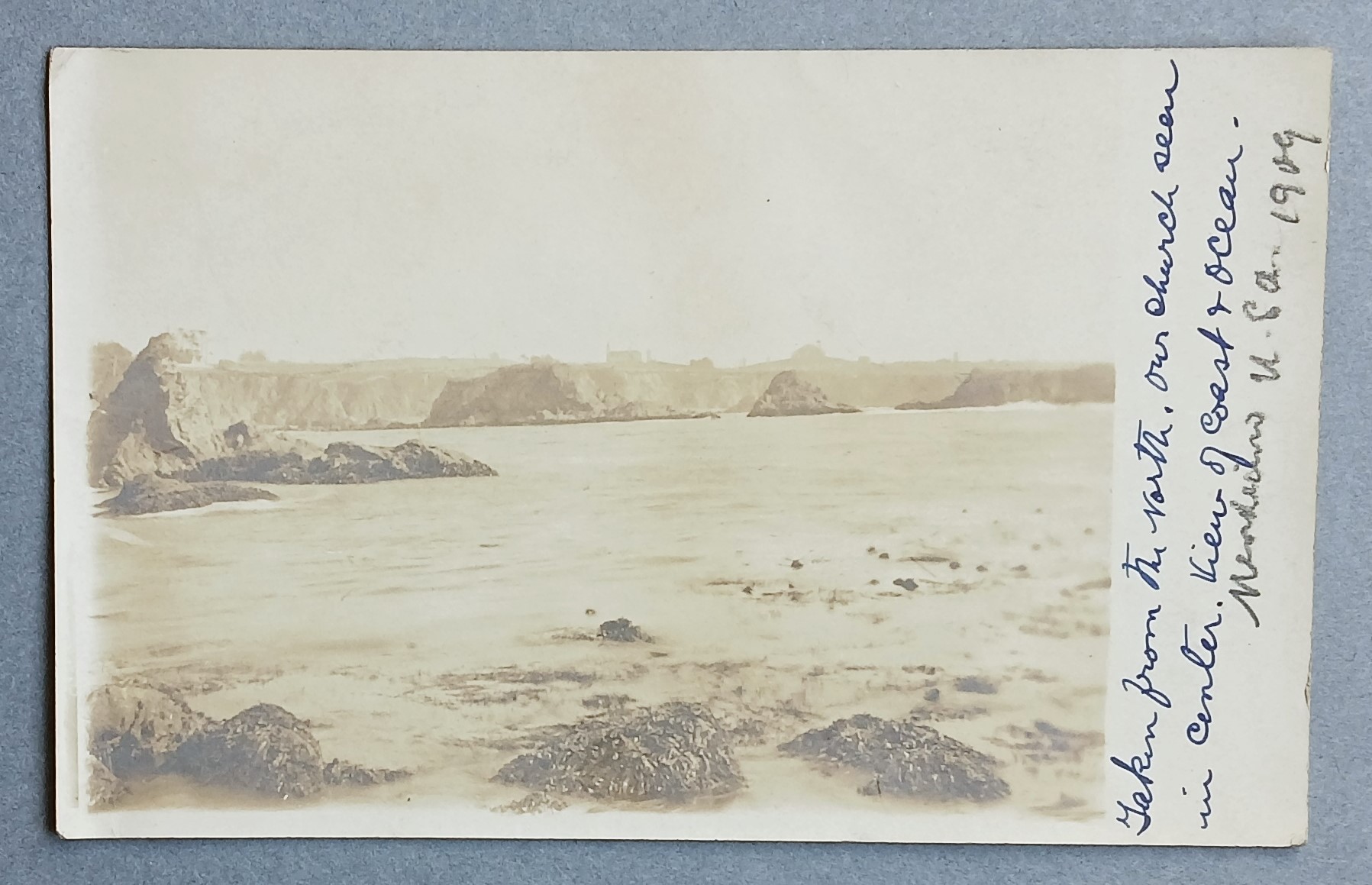 A postcard print view of the coastline in Mendocino County in California. A manuscript annotation reads ‘‘Taken from the North. Our Church seen in centre. View of coast and ocean, Mendocino, USA, 1909’.