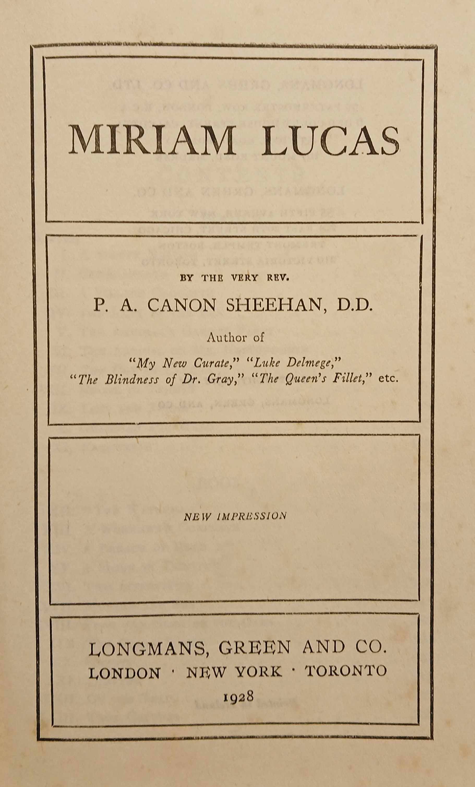 A copy of Canon Patrick Sheehan, ‘Miriam Lucas’ (New York: Longmans, Green, and Co., 1928).