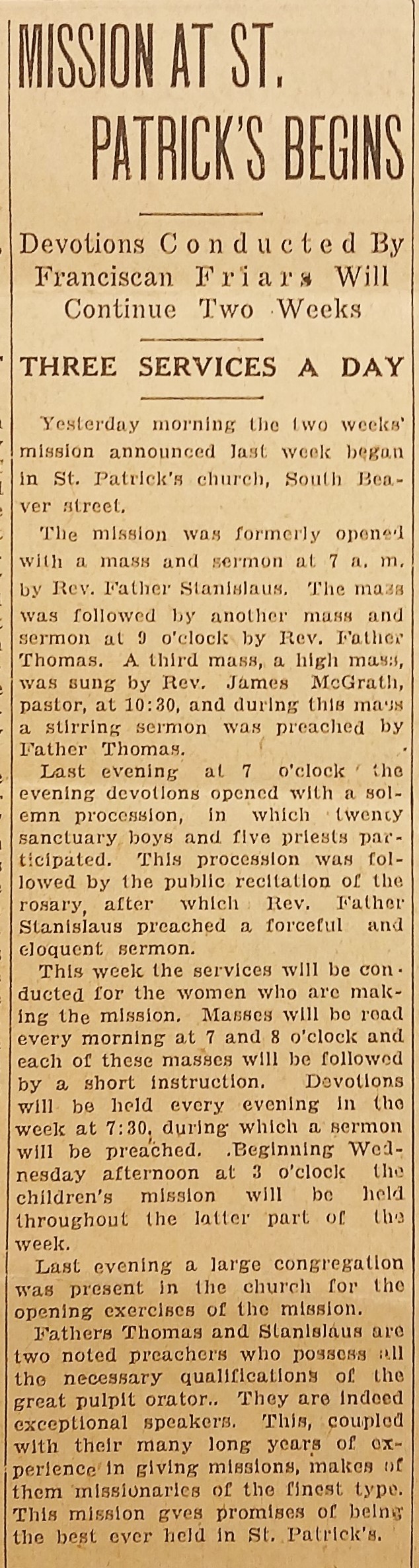 A clipping of an article detailing the commencement of a two-week religious mission at St. Patrick’s Church on South Beaver Street (York, Pennsylvania), led by two Irish Capuchin friars. The services were conducted by Father Stanislaus Kavanagh OFM Cap. and Father Thomas Dowling OFM Cap., described as ‘noted preachers’ and ‘great pulpit orators’ with years of missionary experience. The clipping is taken from ‘The Gazette and Daily’, York, Pennsylvania (9 March 1925).