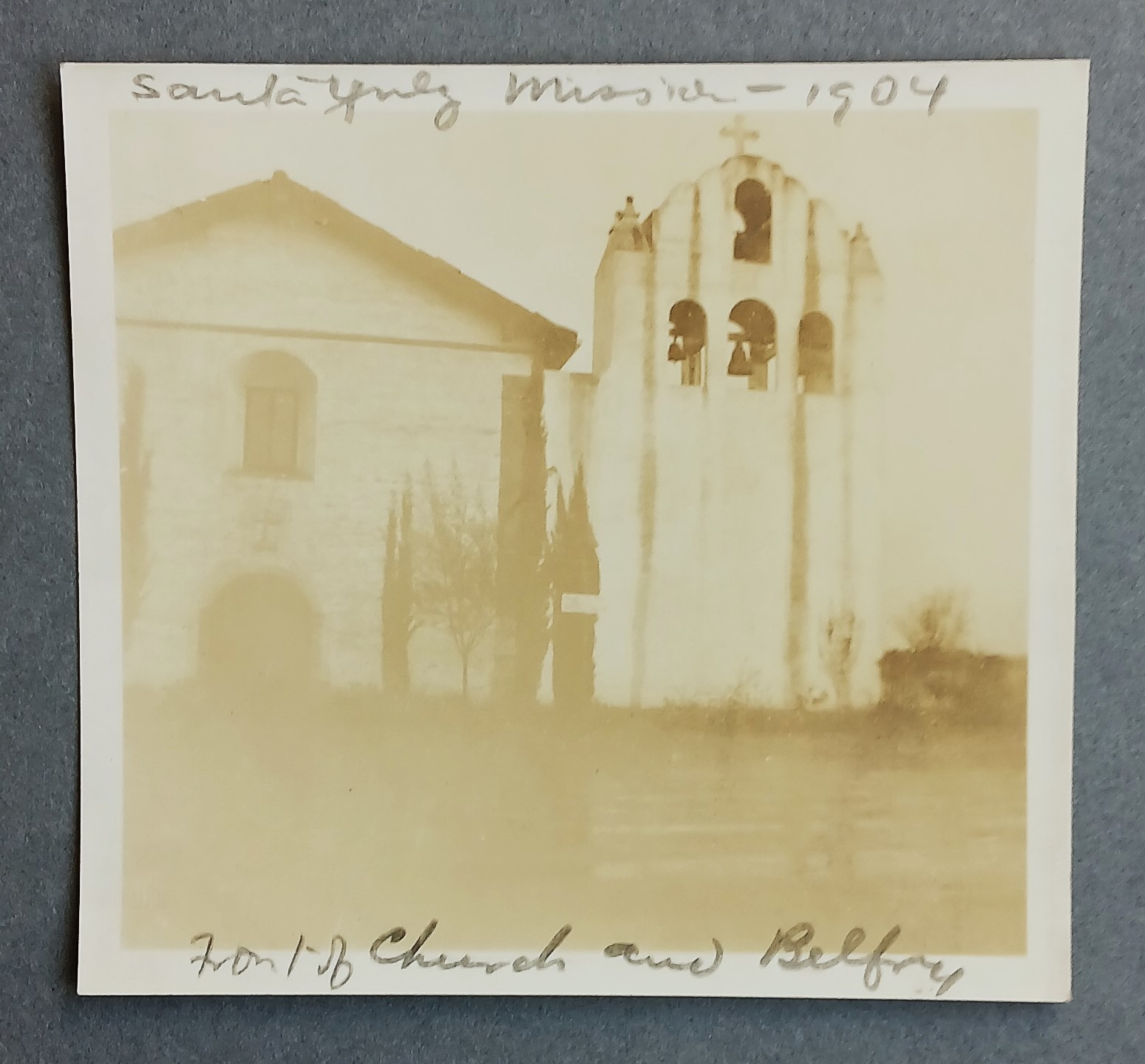 An image of the exterior of Mission Santa Inés (also spelled Santa Ynez) located in Solvang, California. The photograph, titled ‘Front of Church and Belfry’ in the handwritten notes at the bottom, captures the mission as it appeared in 1904. The image shows the main front of the church on the left and the distinct campanario (bell tower) to the right. The bell tower shown in this 1904 photo was later replaced in 1911 after collapsing in a storm.