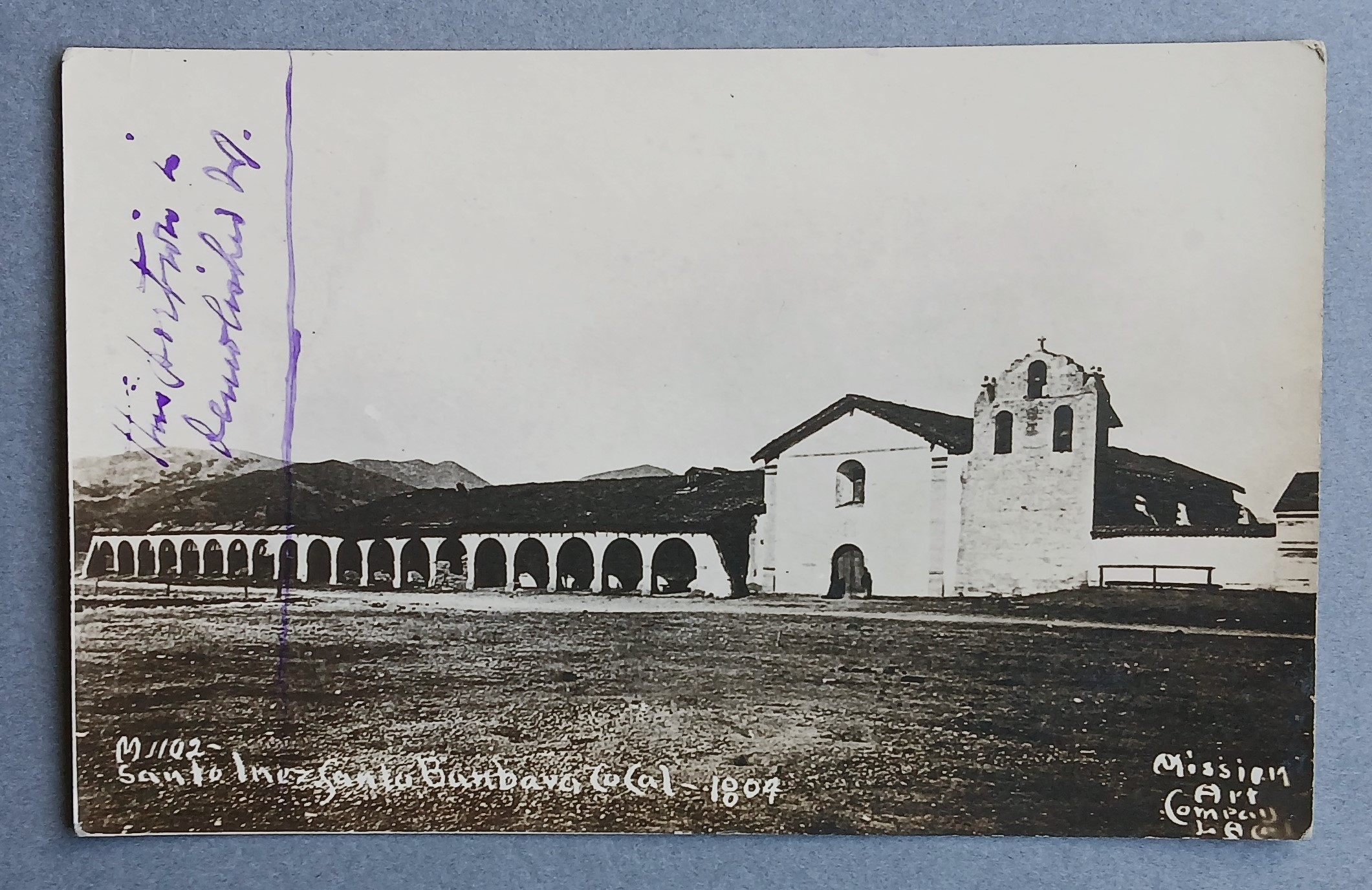 A postcard print of the exterior of Mission Santa Inés in Santa Barbara County, California. The photograph shows the mission’s front facade, including the campanario (bell tower) with its three bells, the main church building, and the long-arched colonnade (convento wing) to the left. A manuscript note on the image reads ‘This portion is demolished. Fr. A’. This is most likely Fr. Albert Bibby OFM Cap. the first Capuchin pastor at the mission. The image is credited to the Mission Art Company, Los Angeles.