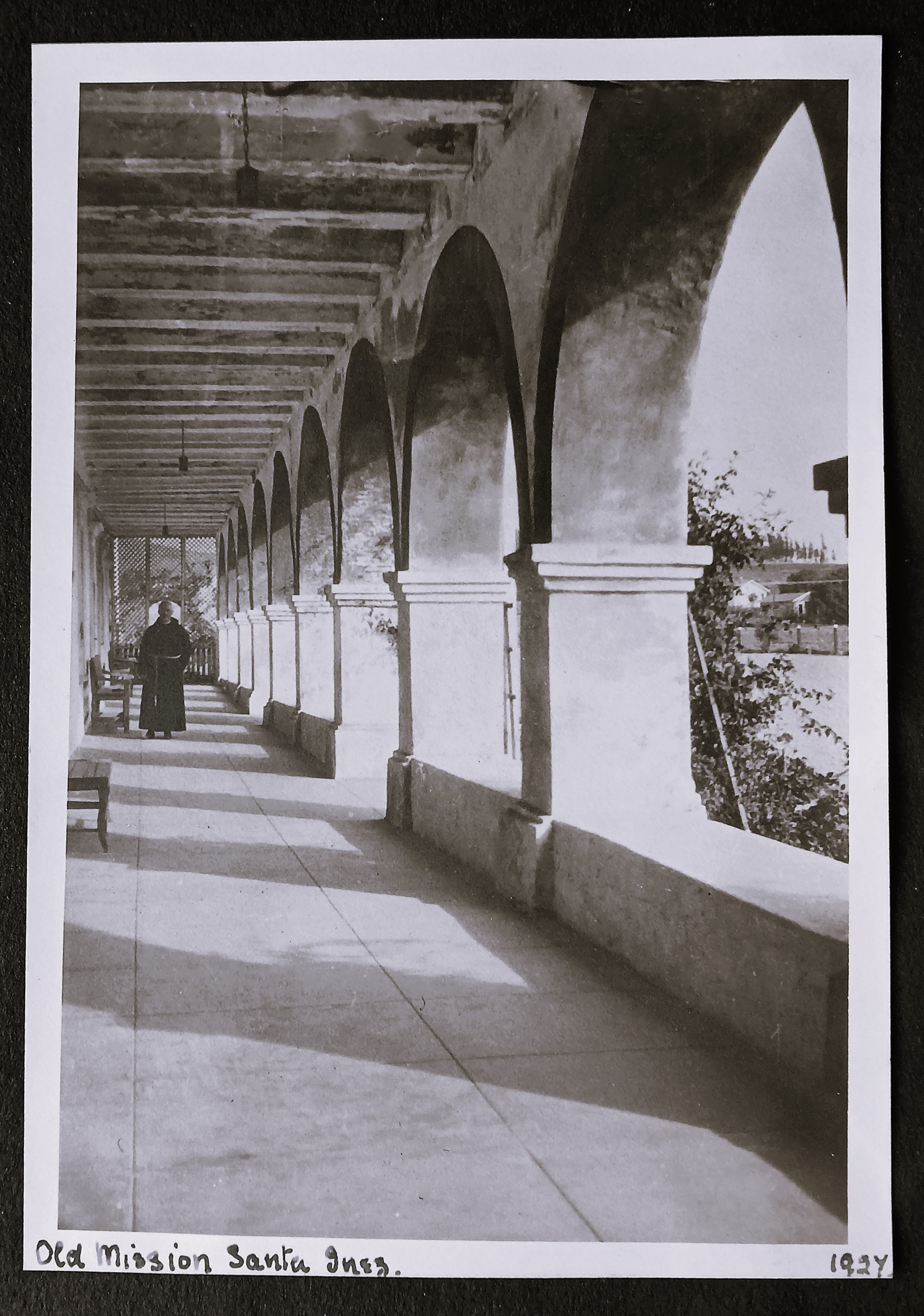 The long-arched colonnade (arcaded porches) at Mission Santa Inés near Solvang in California. The friar in the image is possibly Fr. Reginald O’Hanlon OFM Cap.
