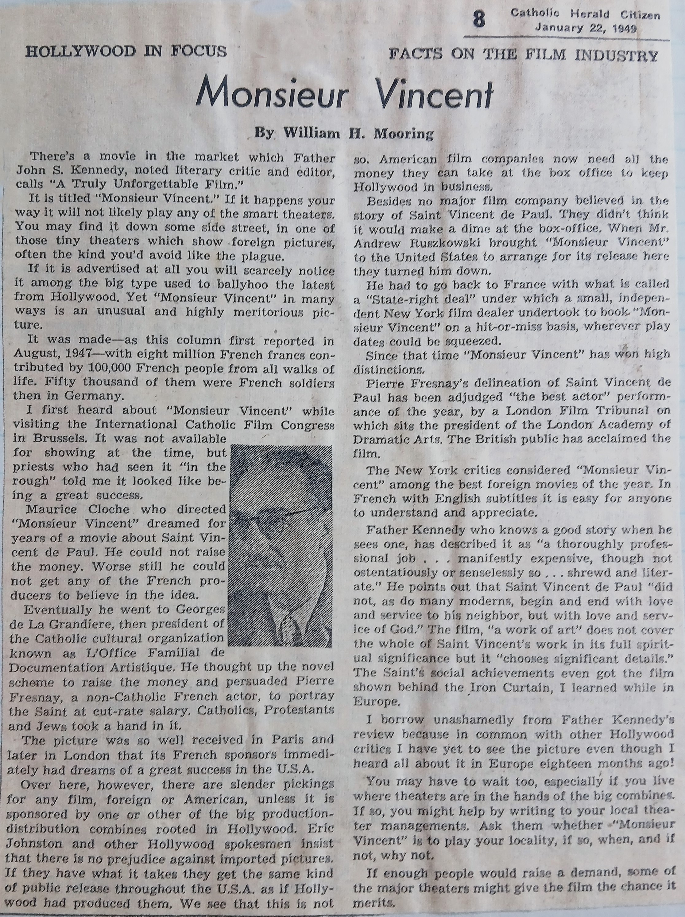 A file containing pages torn from a volume with pasted-in clippings from newspapers and literary magazines. Many of the clippings refer to ‘Monsieur Vincent’, a 1947 French film about Saint Vincent de Paul. Also includes letters to Fr. Gerald McCann OFM Cap. from the International Apostolic Film Society and from the Irish American Film Corporation (Alan C. Macauley) regarding a film titled ‘Welcome to Ireland’.