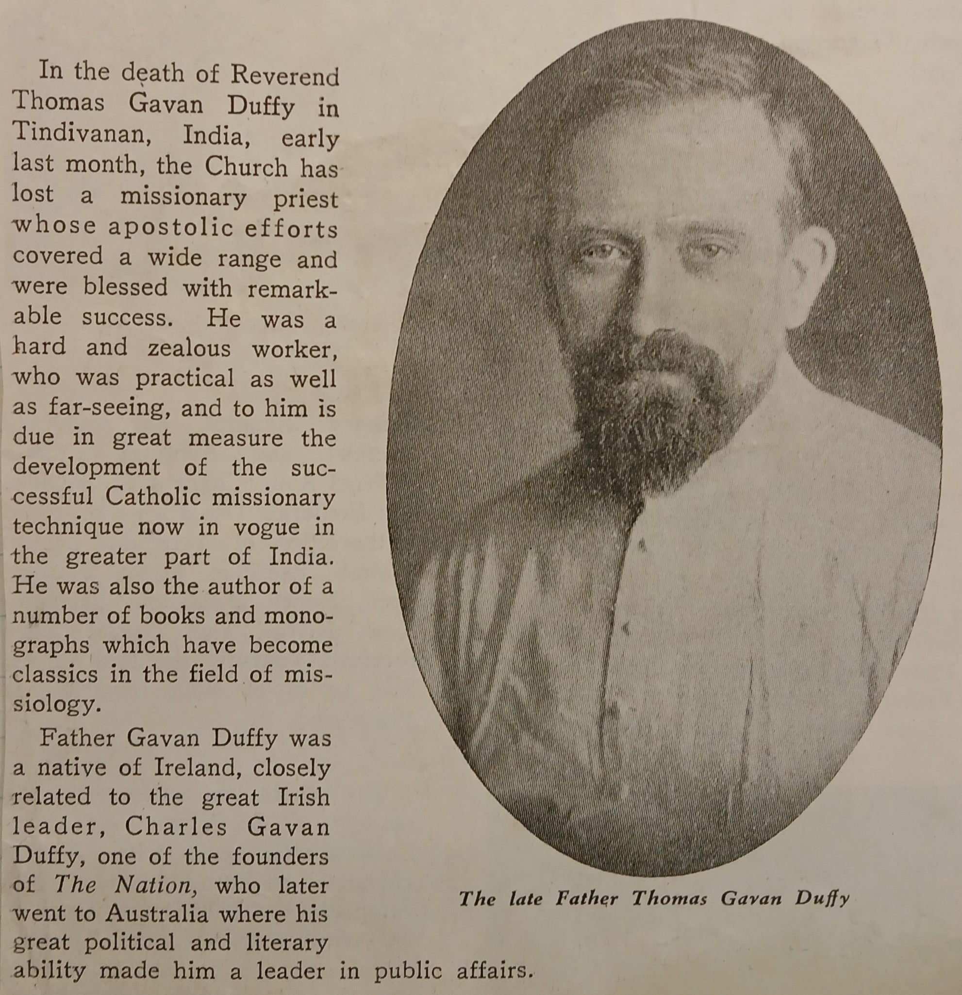 A clipping of an obituary for Fr. Thomas Gavan Duffy, a missionary of Irish parentage working in India. He died on 8 September 1941 aged 52.
