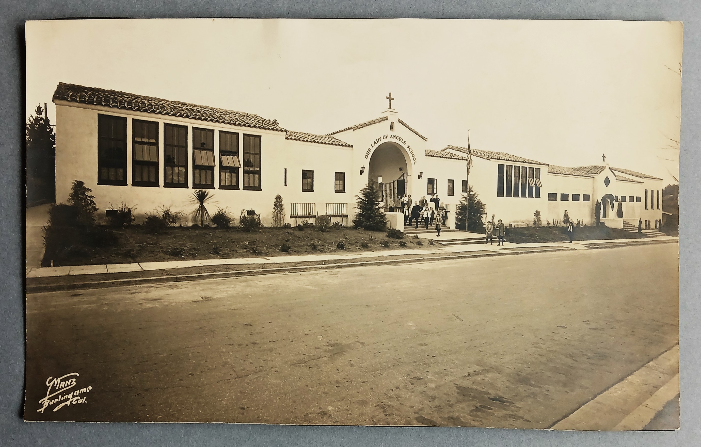 Photograph of the exterior of Our Lady of Angels School, Burlingame, California. The photograph was taken from the left on Cortez Avenue. Fr. Thomas Dowling OFM Cap. is among those standing outside the entrance to the school. The image is credited to Manz, Burlingame, California.