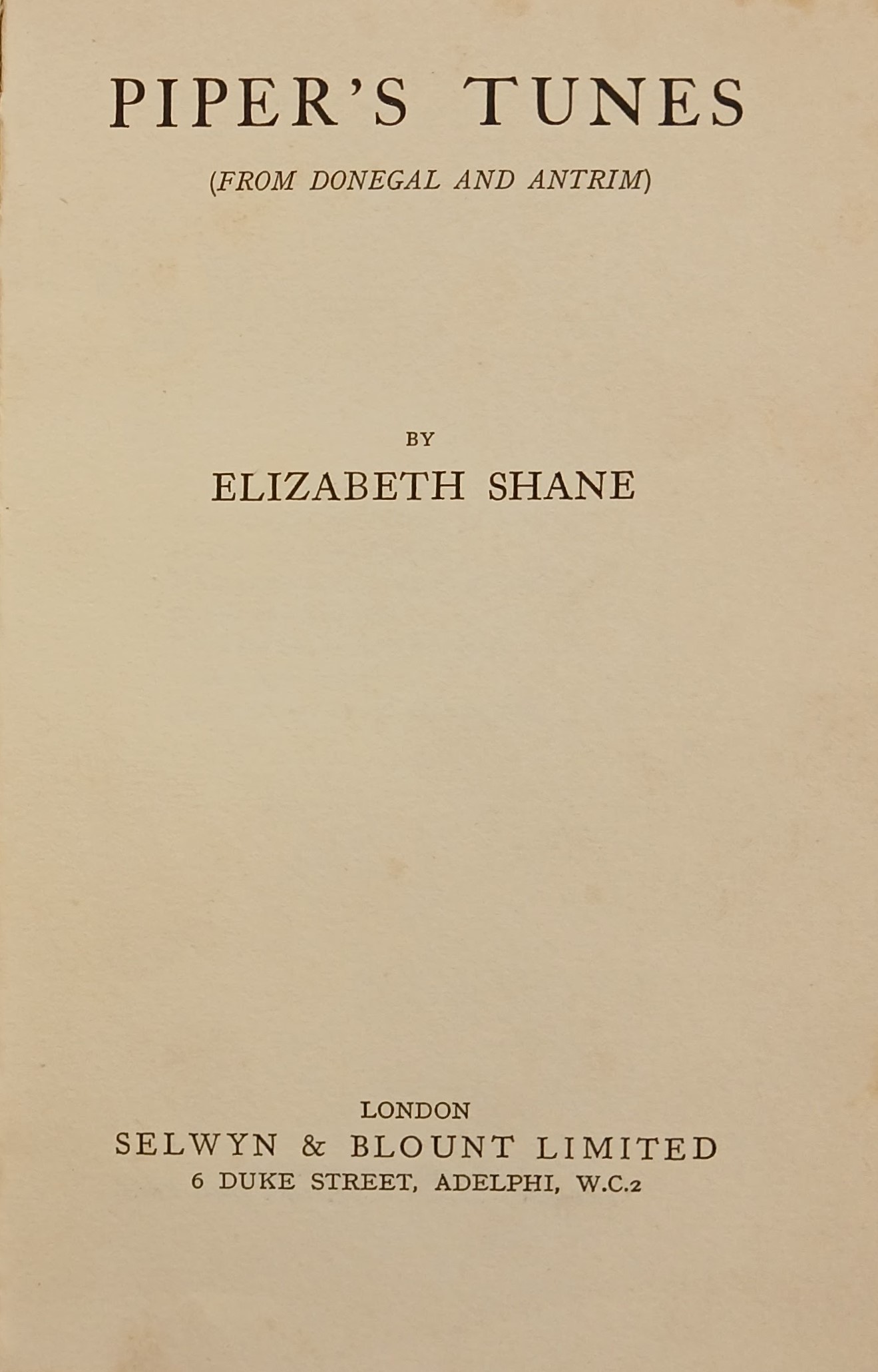 A copy of ‘Piper’s tunes / (from Donegal and Antrim) / by Elizabeth Shane’ (London: Selwyn & Blount Limited 6 Duke Street, Adelphi, W.C.2, [1927]).