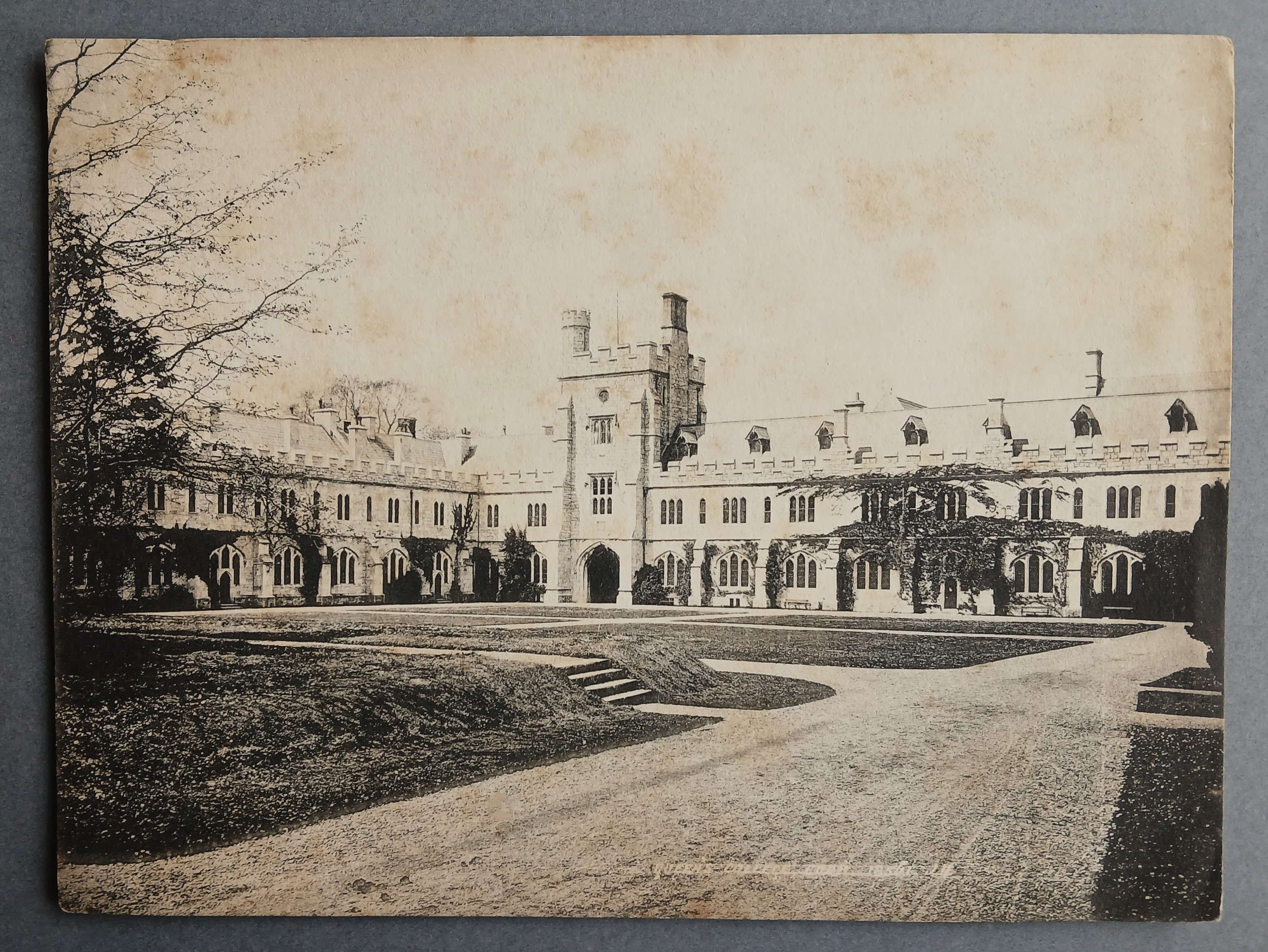 A print showing the ‘Long Hall’ and the clock tower of the Quadrangle in Queen’s University College, Cork.