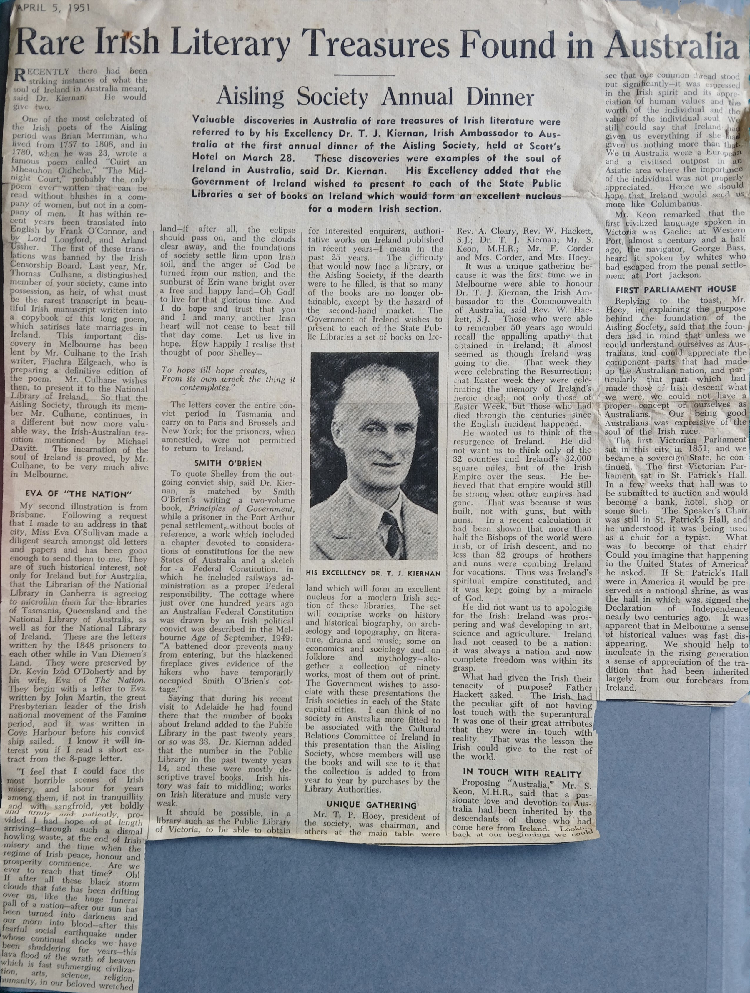 A clipping of an article titled ‘Rare Irish literary treasures found in Australia’ taken from ‘The Advocate’ (5 April 1951). Reference is made in the article to the discovery of a copy of Brian Merriman’s ‘The Midnight Court’ (1780). ‘The Advocate’ was published by the Catholic Archdiocese of Melbourne.