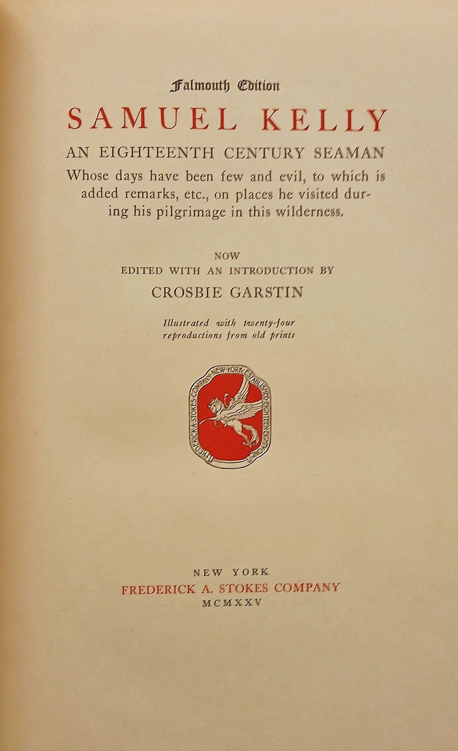 A copy of ‘Samuel Kelly / an eighteenth century seaman, whose days have been few and evil, to which is added remarks, etc., on places he visited during his pilgrimage in this wilderness / Now edited with an introduction by Crosbie Garstin; illustrated with twenty-four reproductions from old prints’ (New York, Frederick A. Stokes Company, 1925).