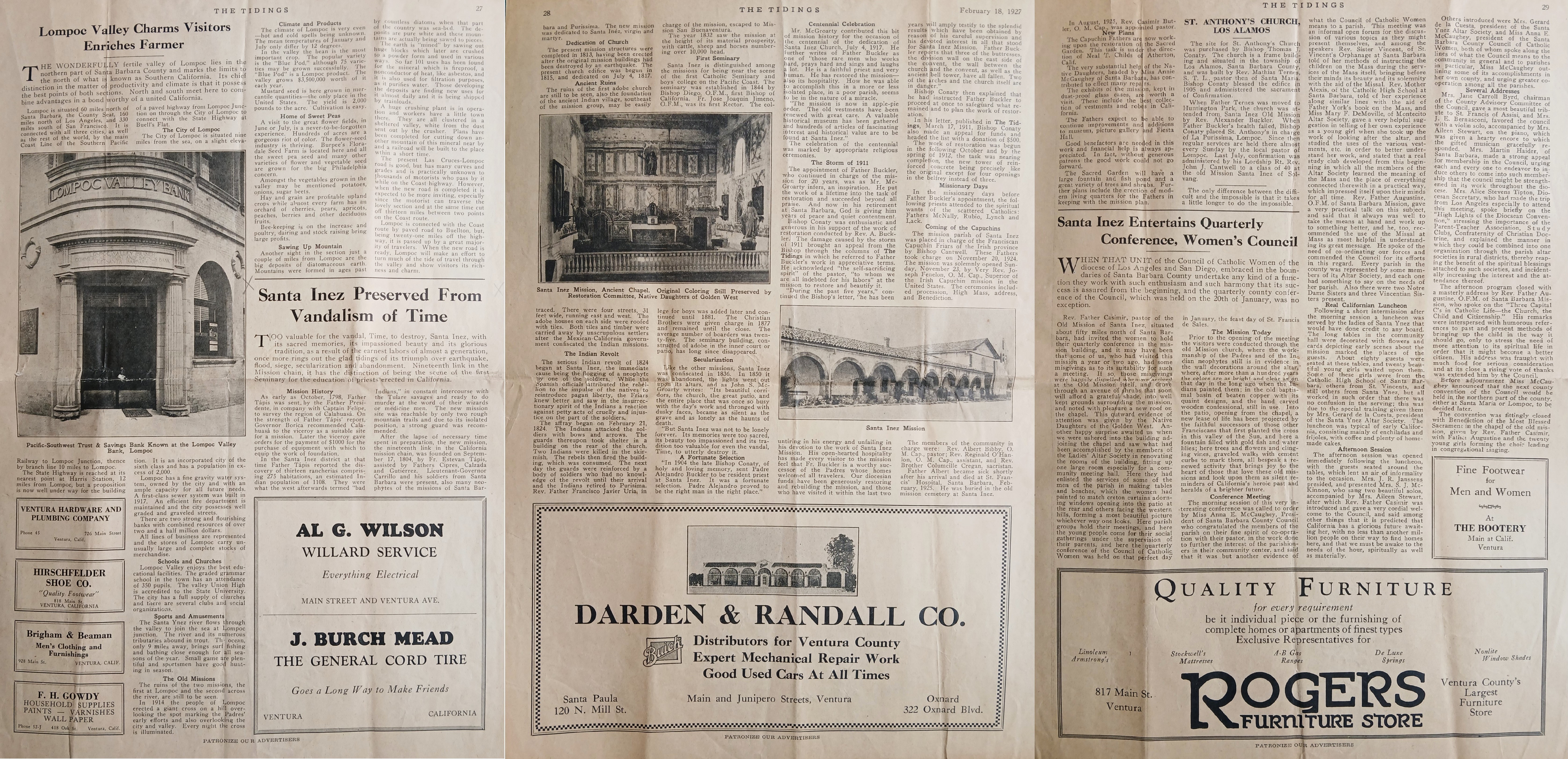 A clipping of an article outlining the history of Mission Santa Inés (sometimes spelled Santa Inez or Santa Ynez) in California. The article refers to the role played by the Irish Capuchin friars in mission’s restoration from 1924 onward. The clipping is taken from ‘The Tidings’ (18 February 1927).