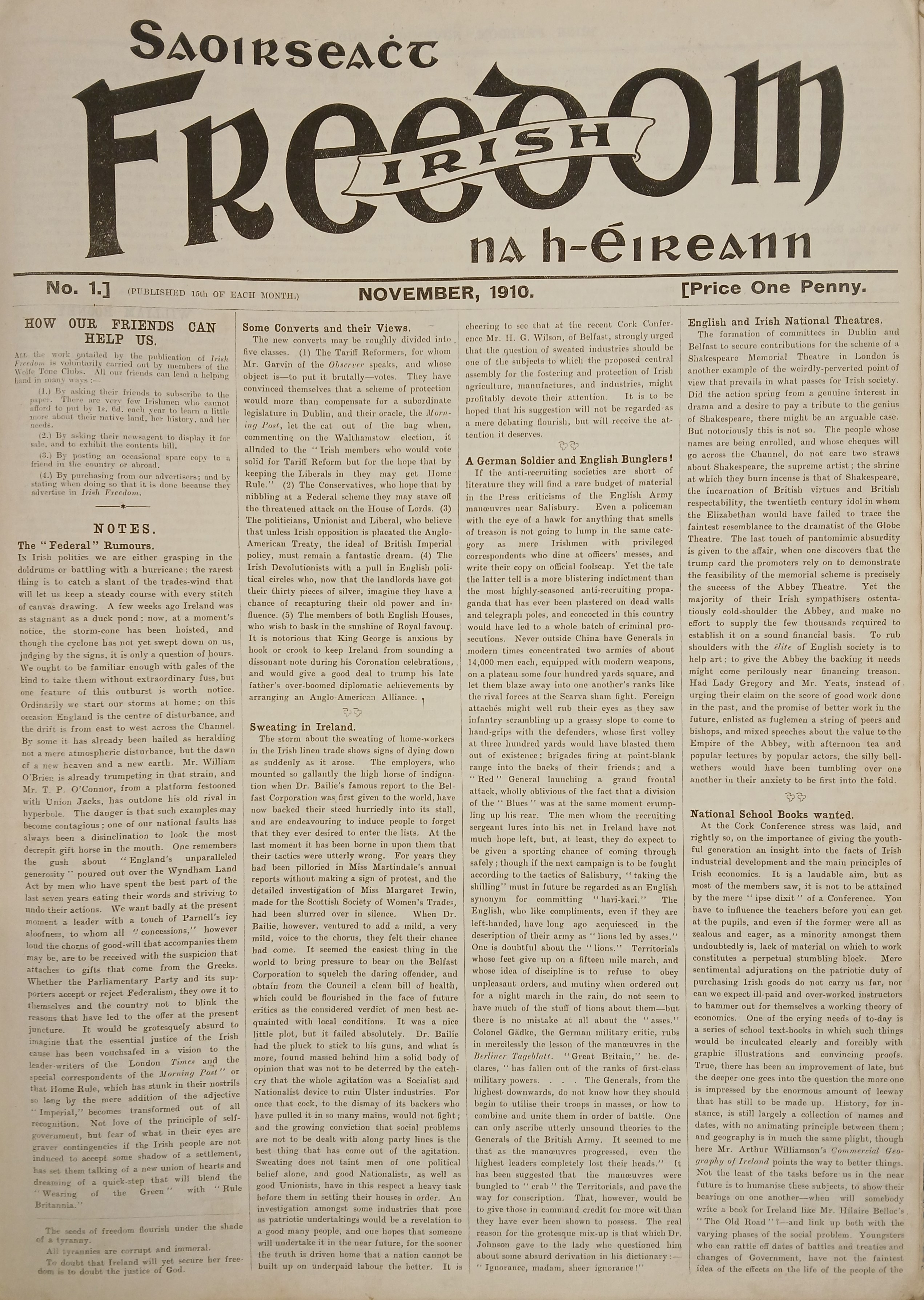 This newspaper (an ‘official’ publication of the Irish Republican Brotherhood) operated out of offices at 5 Findlater Place (now Cathal Brugha Street). The establishment of this paper is generally credited to Tom Clarke. As soon as he returned to Ireland in 1907, he recognised the need for a newspaper, but it took him some time to raise the funds. By 1910 he had managed to get enough money to make a start and named Seán MacDermott as the newspaper’s manager.