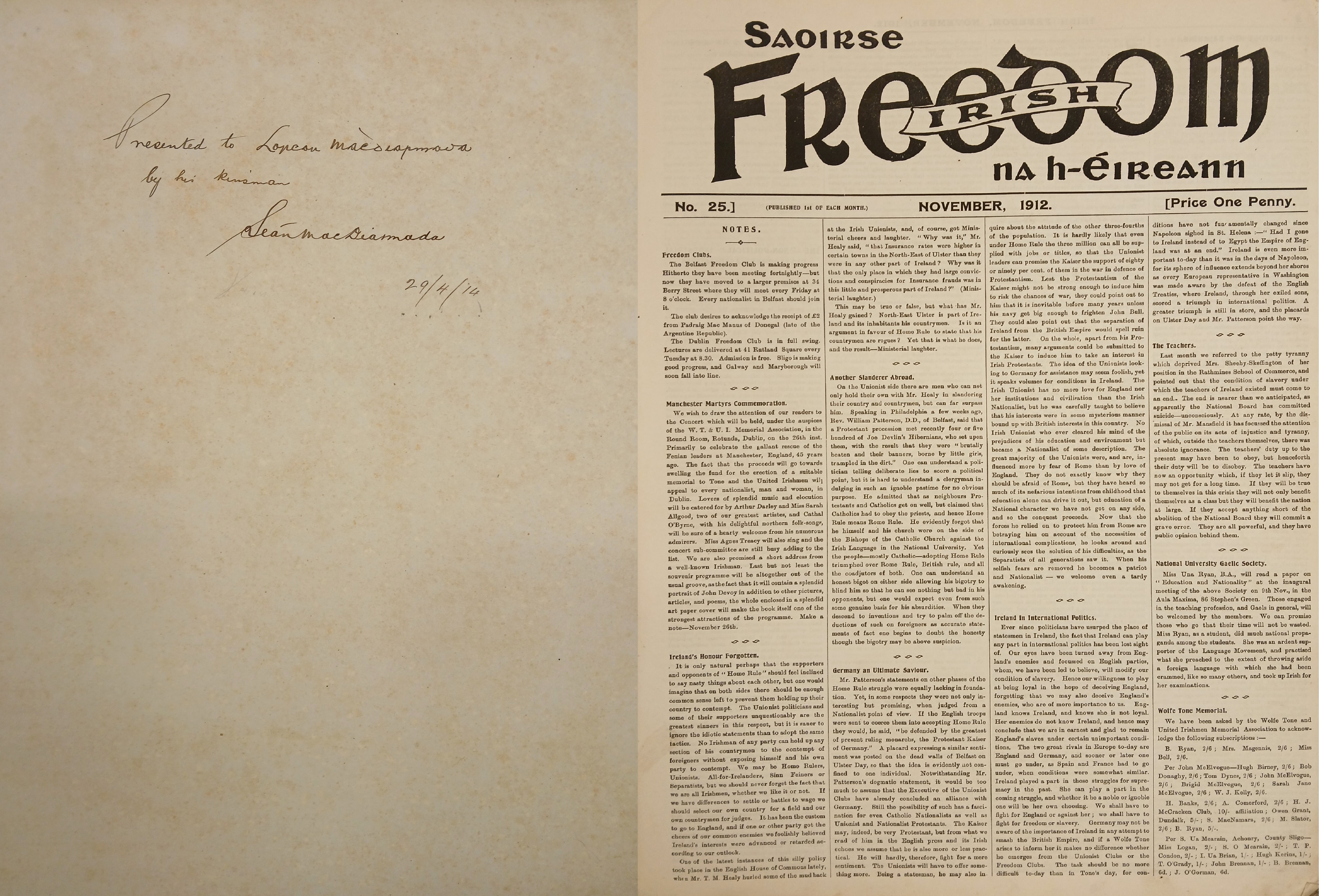 A bound volume containing copies of ‘Saoirse na h-Éireann / Irish Freedom’ from November 1912 to October 1913 (Nos. 25-35). A manuscript annotation on the page reads ‘Presented to Lorcan MacDiarmada by his kinsman Seán Mac Diarmada / 29 April 1914’.