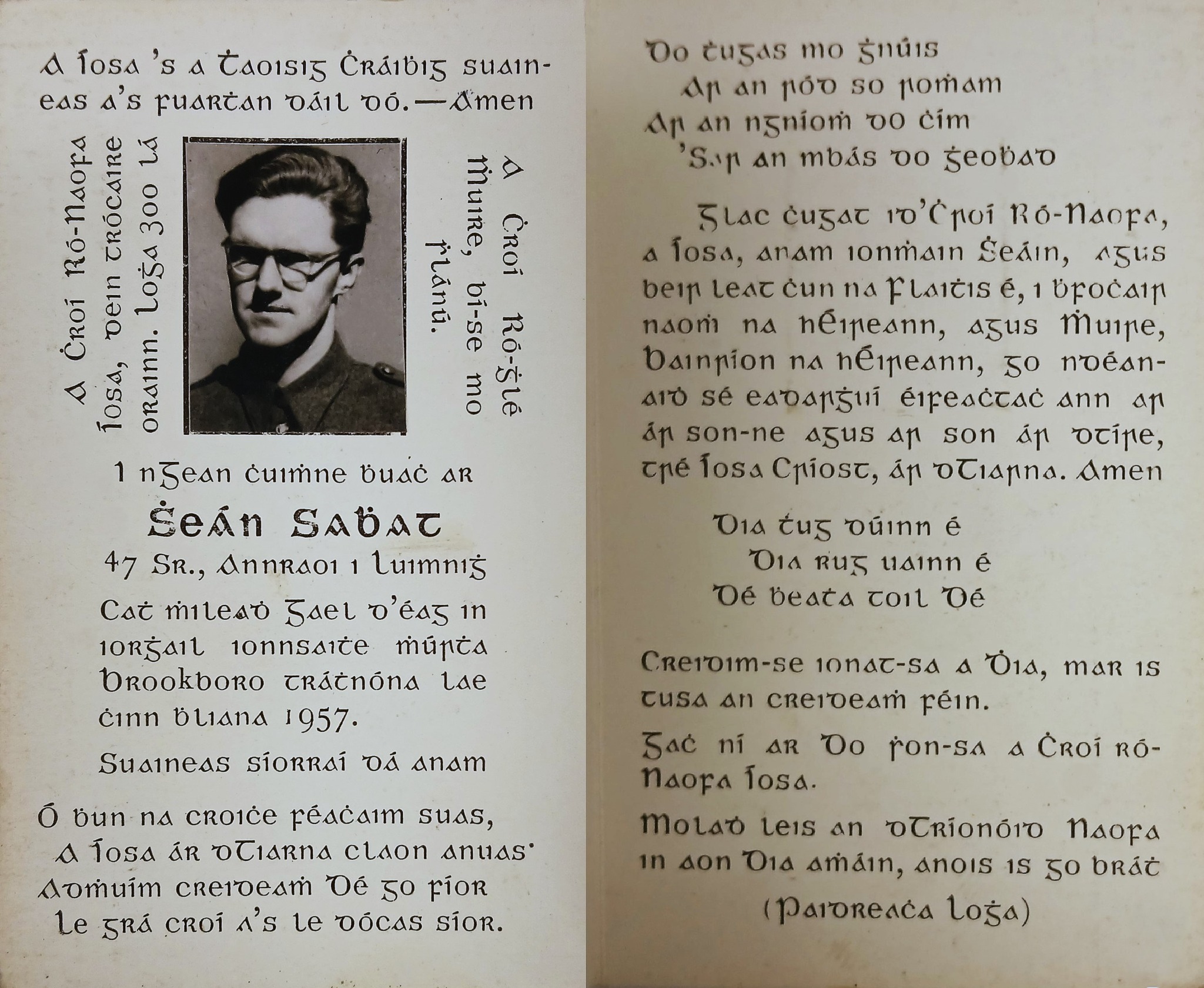 A memorial card for Seán South (Seán Sabhat) who died on 1 January 1957, aged twenty-eight. South was killed during an IRA raid on a Royal Ulster Constabulary barracks at Brookeborough in County Fermanagh.