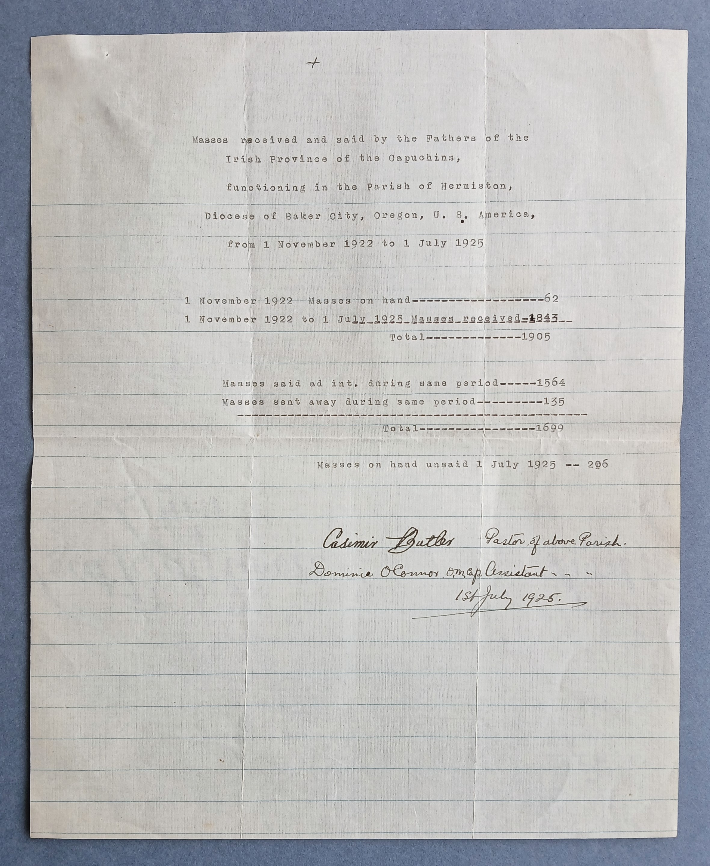 Statement of Masses for the Parish of Hermiston in the Diocese of Baker City, Oregon, covering the period from 1 November 1922, to 1 July 1925. The ledger tracks the fulfilment of Mass intentions (spiritual requests with associated stipends) by the Irish Capuchin friars: Total intentions received: 1,905 (including 62 carried over from 1922). The document is signed by Fr. Casimir Butler OFM Cap. and Fr. Dominic O’Connor OFM Cap.