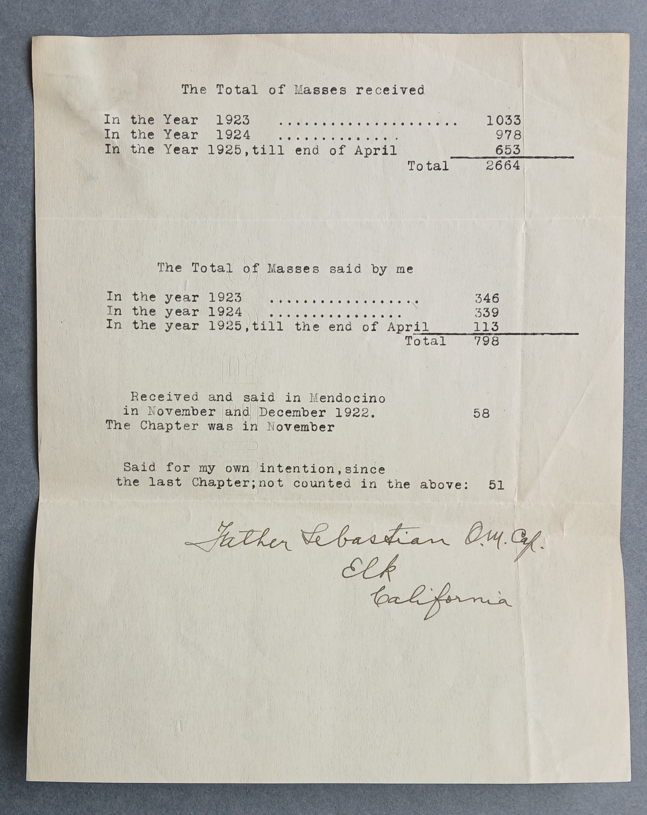 Statement of Masses for the Blessed Sacrament Church in Elk, Mendocino County, California, covering the period from November 1922 to April 1925. The document is signed by Father Sebastian Brennan OFM Cap.
