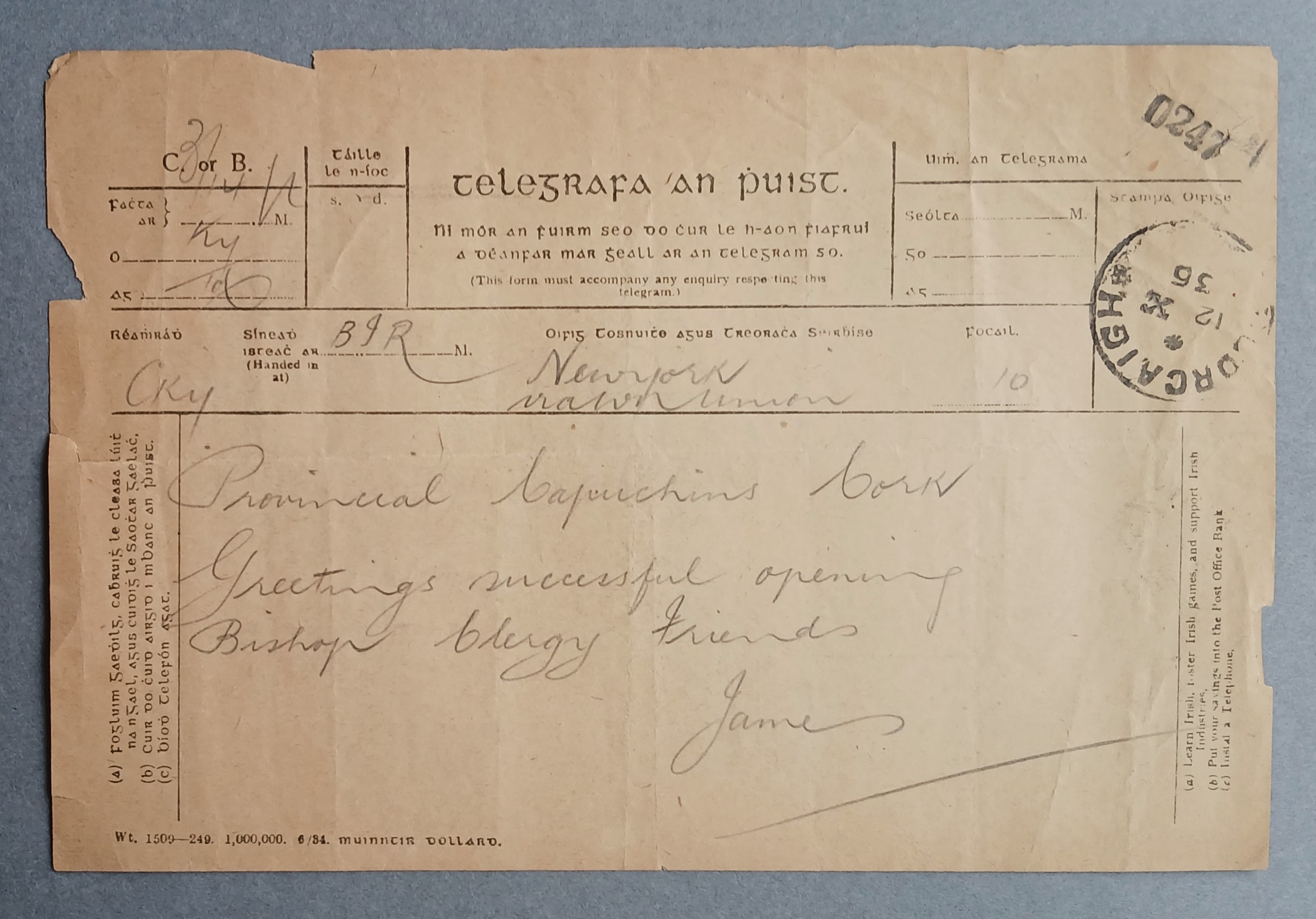 Telegram from Fr. James O’Mahony OFM Cap. to Fr. Edwin Fitzgibbon OFM Cap., Provincial Minister, referring to the successful opening of a mission in New York.