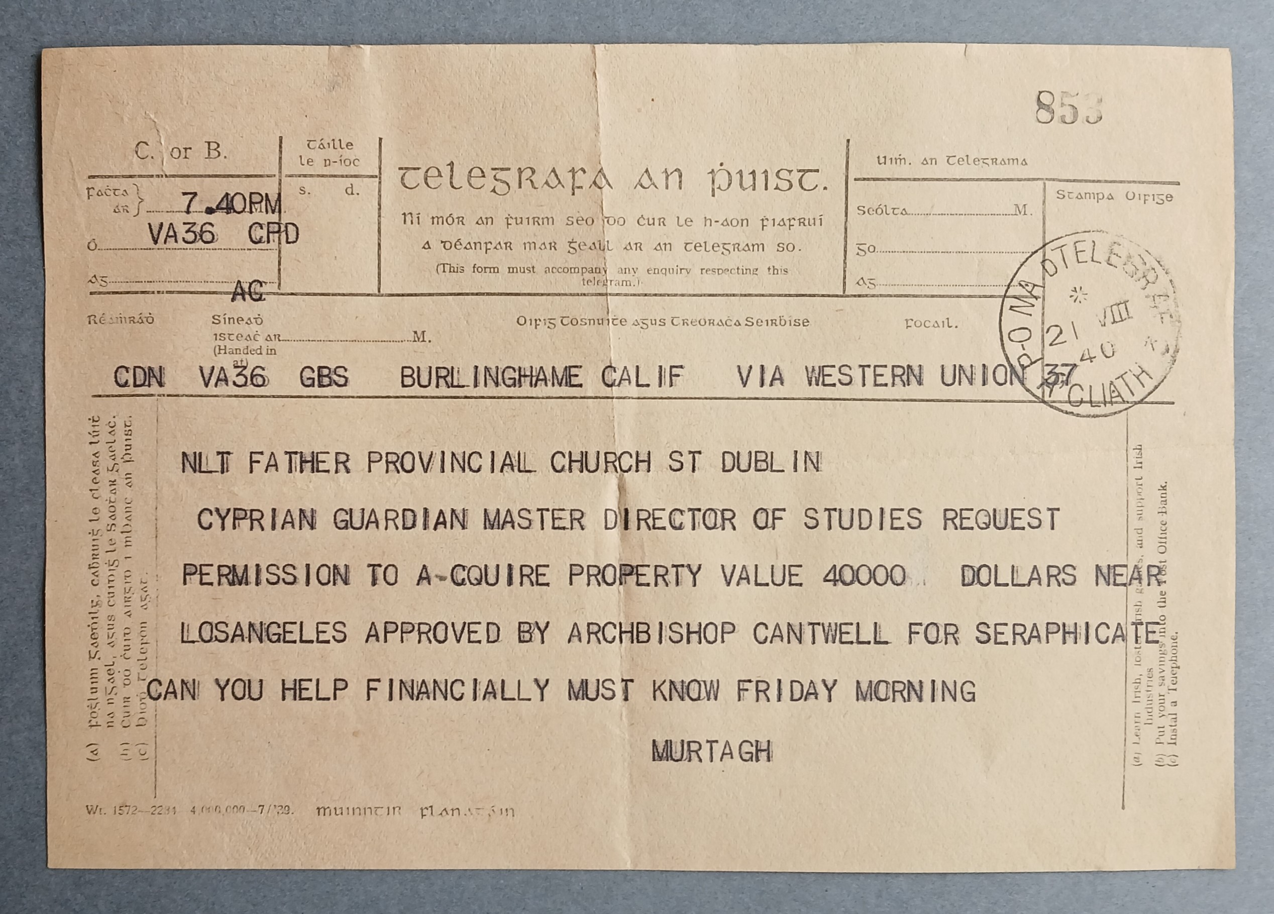 Telegram from Fr. Stephen Murtagh OFM Cap. to Fr. Colman Griffin OFM Cap., Provincial Minister, referring to an urgent request regarding a major property acquisition. The property is valued at $40,000 and is intended for a ‘Seraphicate’ (a preparatory school or seminary for those interested in joining the Capuchin Franciscan Order).